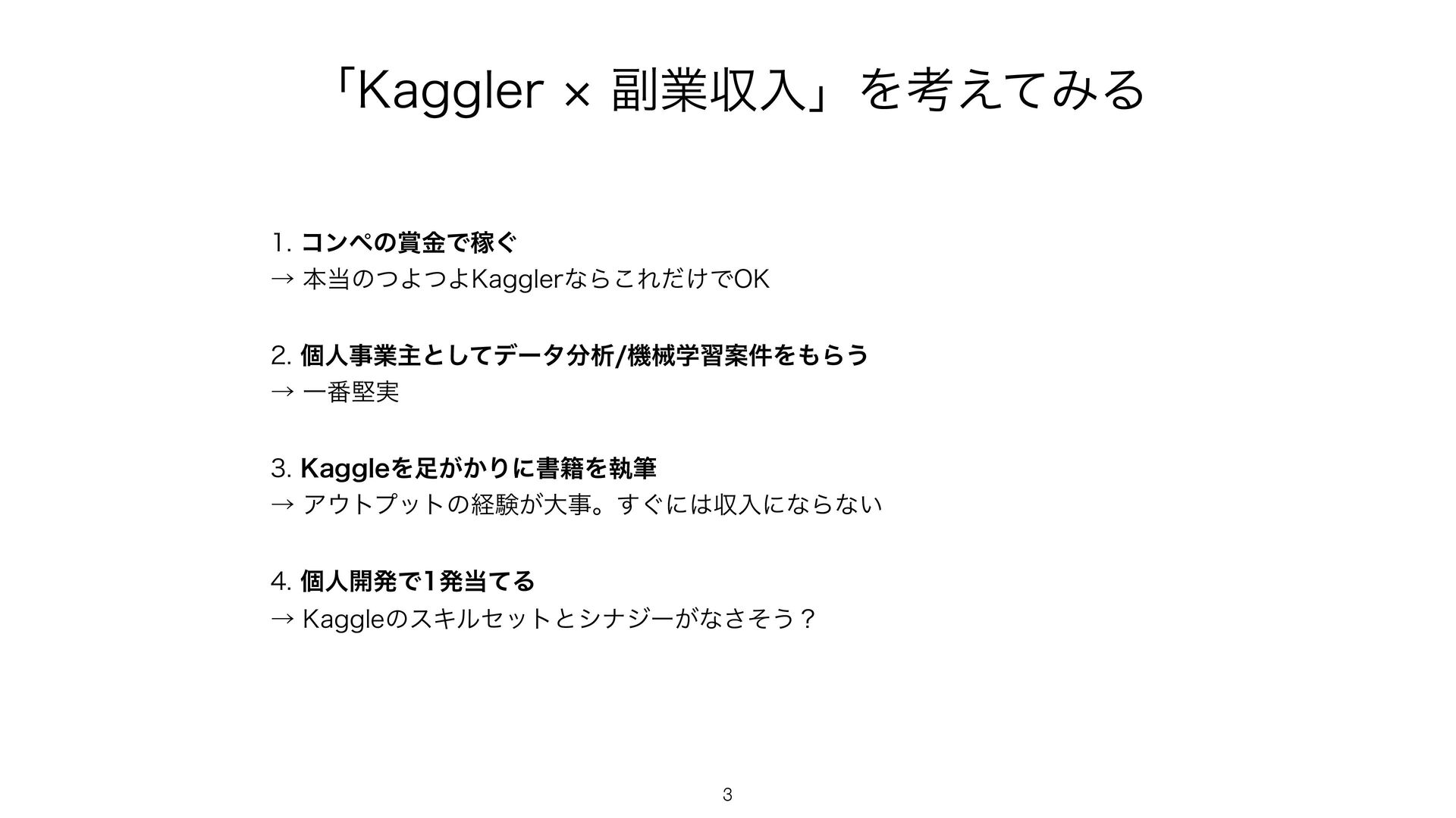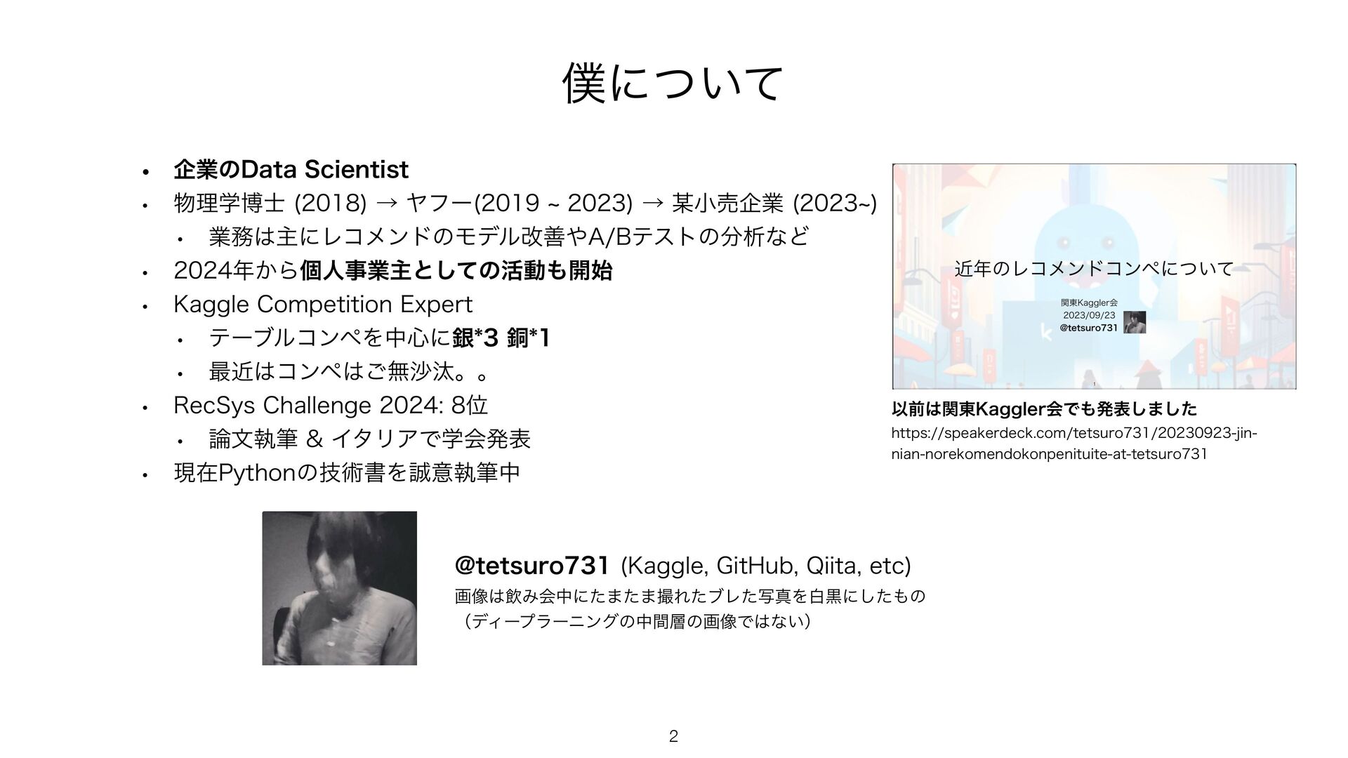 w ۀओʹϨίϝϯυͷϞσϧվળ"#ςετͷੳͳͲ w ͔Βݸਓࣄۀओͱͯ͠ͷ׆ಈ։࢝ w ,BHHMF$PNQFUJUJPO&YQFSU w ςʔϒϧίϯϖΛத৺ʹۜ ಔ w ࠷ۙίϯϖ͝ແࠫଡɻɻ w 3FD4ZT$IBMMFOHFҐ w จࣥචΠλϦΞͰֶձൃද w ݱࡏ1ZUIPOͷٕज़ॻΛҙࣥචத !UFUTVSP ,BHHMF (JU)VC 2JJUB FUD ը૾ҿΈձதʹͨ·ͨ·ࡱΕͨϒϨͨࣸਅΛനࠇʹͨ͠ͷ ʢσΟʔϓϥʔχϯάͷதؒͷը૾Ͱͳ͍ʣ 2 Ҏલؔ౦,BHHMFSձͰൃද͠·ͨ͠ IUUQTTQFBLFSEFDLDPNUFUTVSPKJO OJBOOPSFLPNFOEPLPOQFOJUVJUFBUUFUTVSP