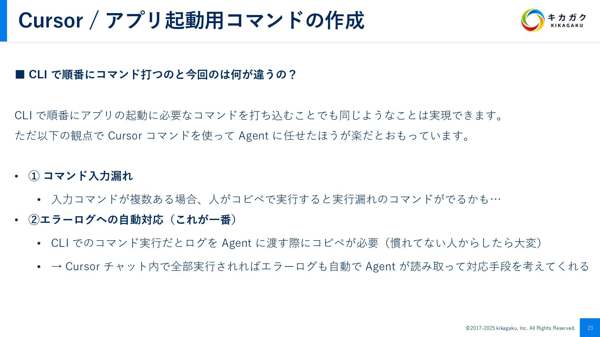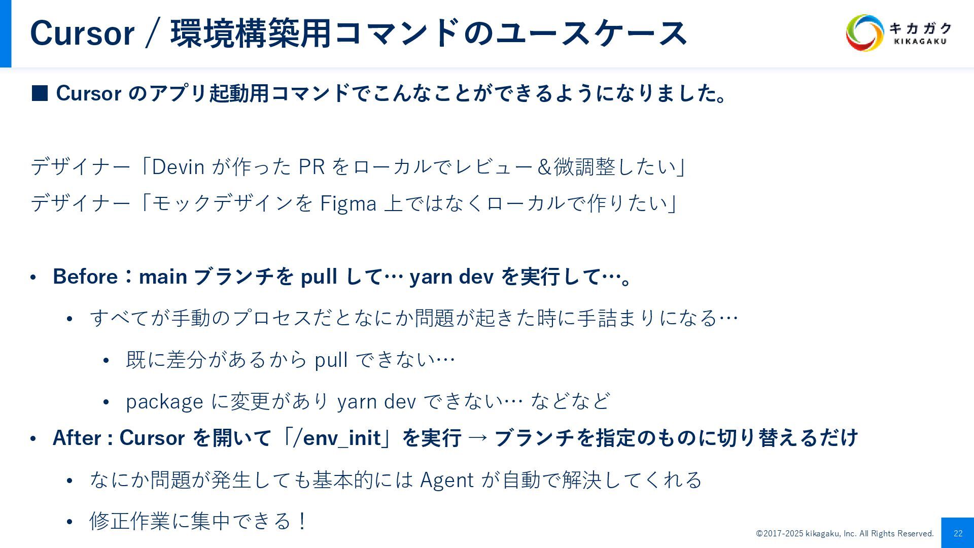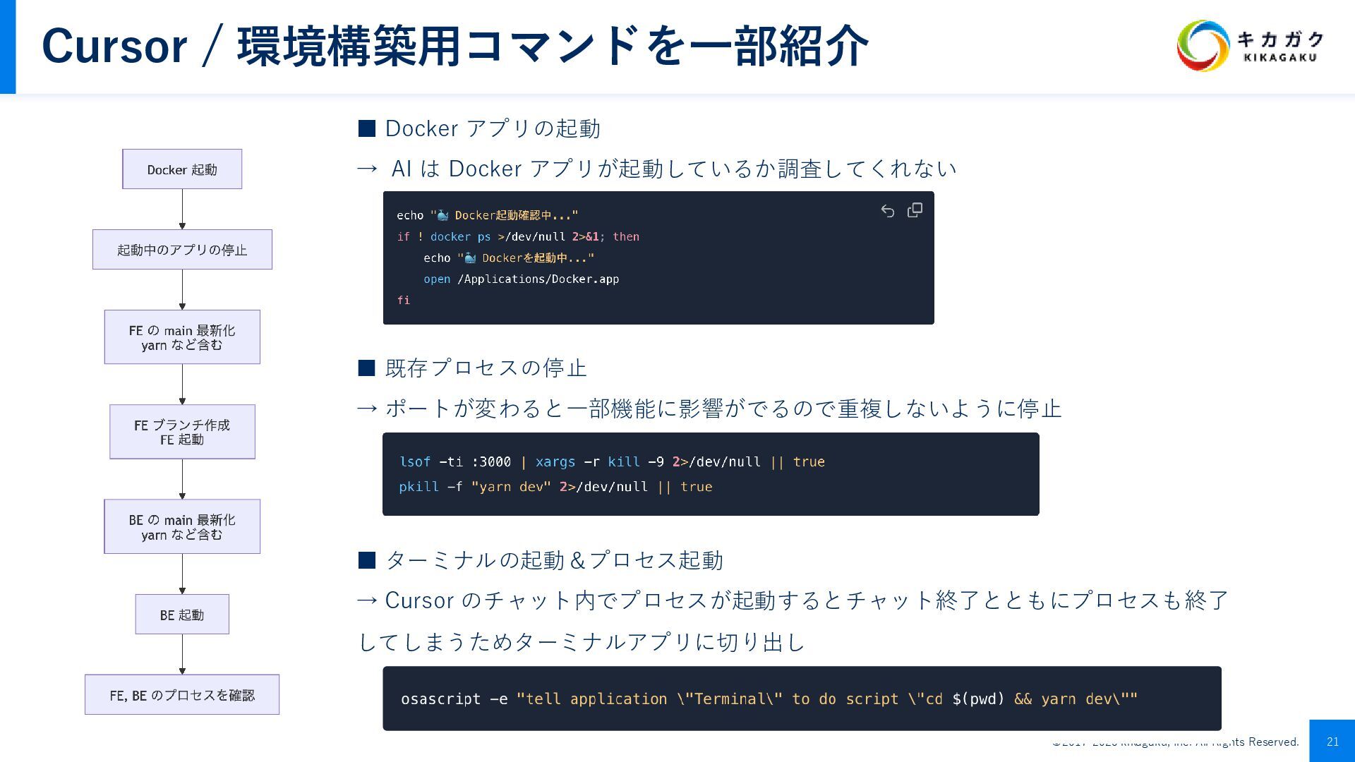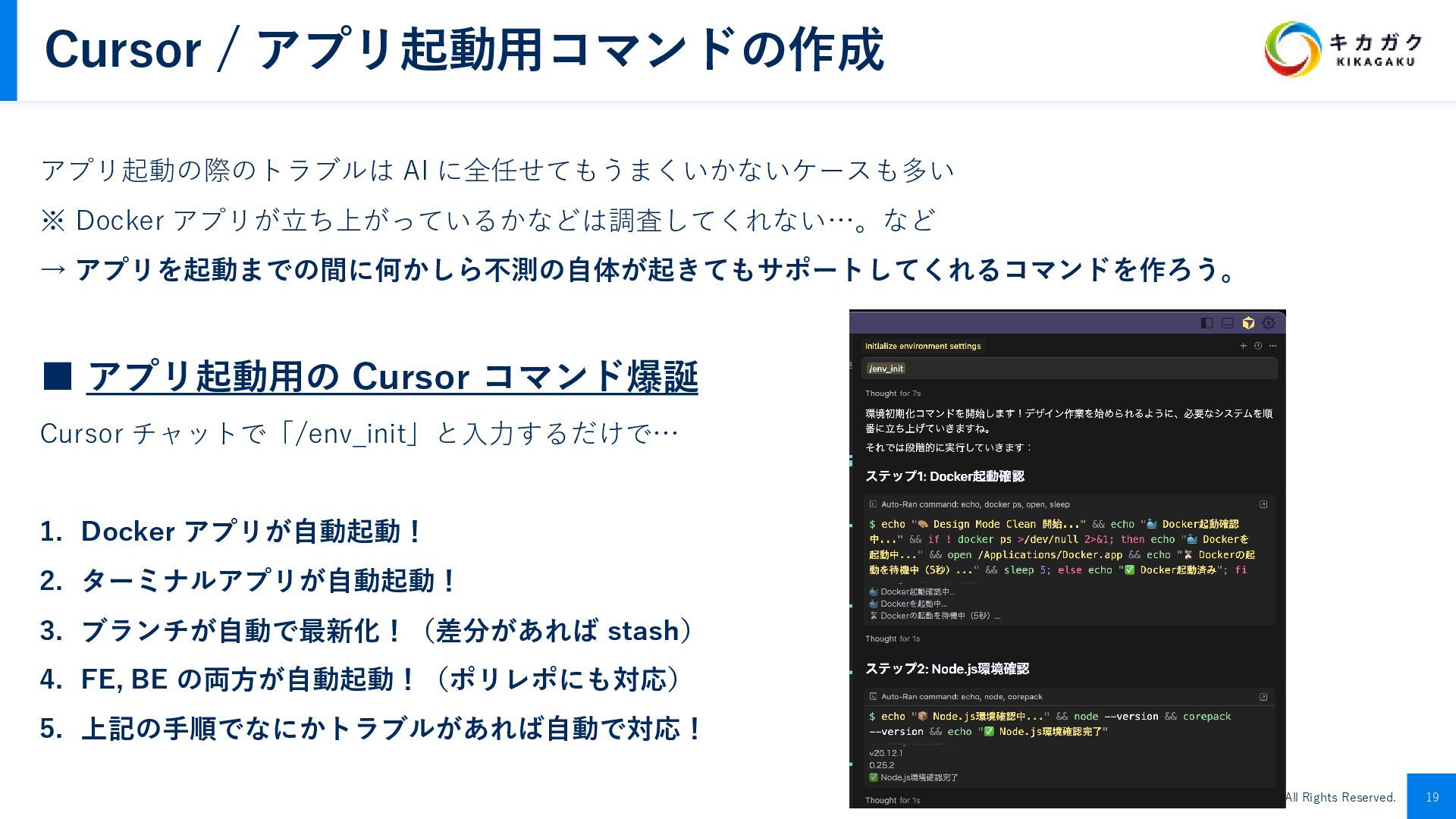 アプリ起動の際のトラブルは AI に全任せてもうまくいかないケースも多い ※ Docker アプリが立ち上がっているかなどは調査してくれない…。など → アプリを起動までの間に何かしら不測の自体が起きてもサポートしてくれるコマンドを作ろう。 ▪ アプリ起動用の Cursor コマンド爆誕 Cursor チャットで「/env_init」と入力するだけで… 1. Docker アプリが自動起動! 2. ターミナルアプリが自動起動! 3. ブランチが自動で最新化!(差分があれば stash) 4. FE, BE の両方が自動起動!(ポリレポにも対応) 5. 上記の手順でなにかトラブルがあれば自動で対応!