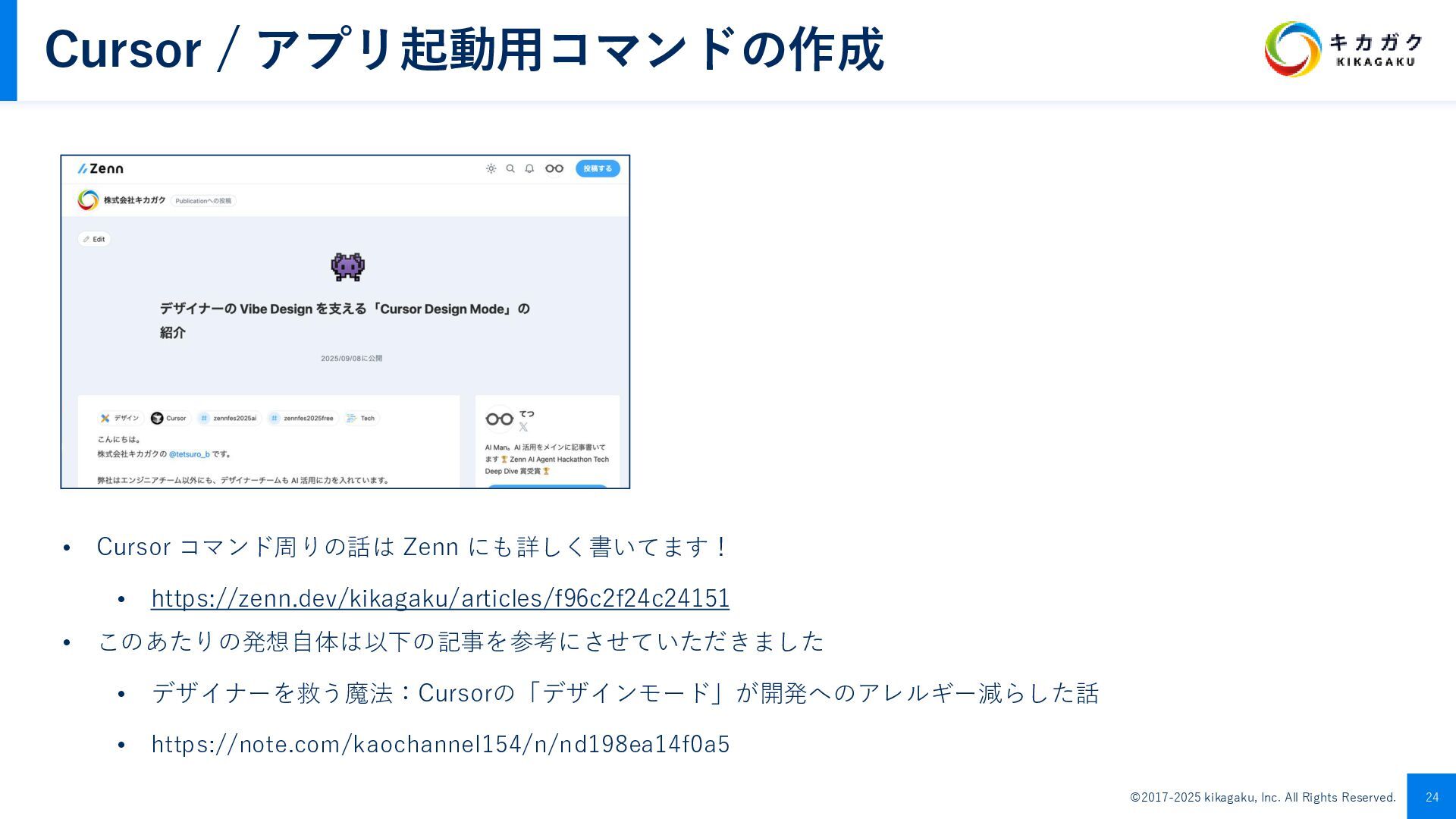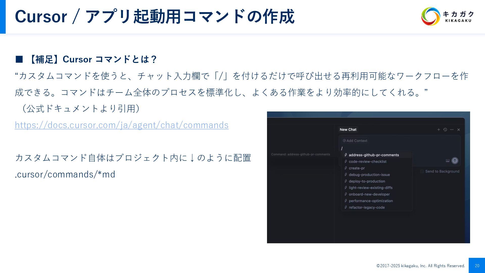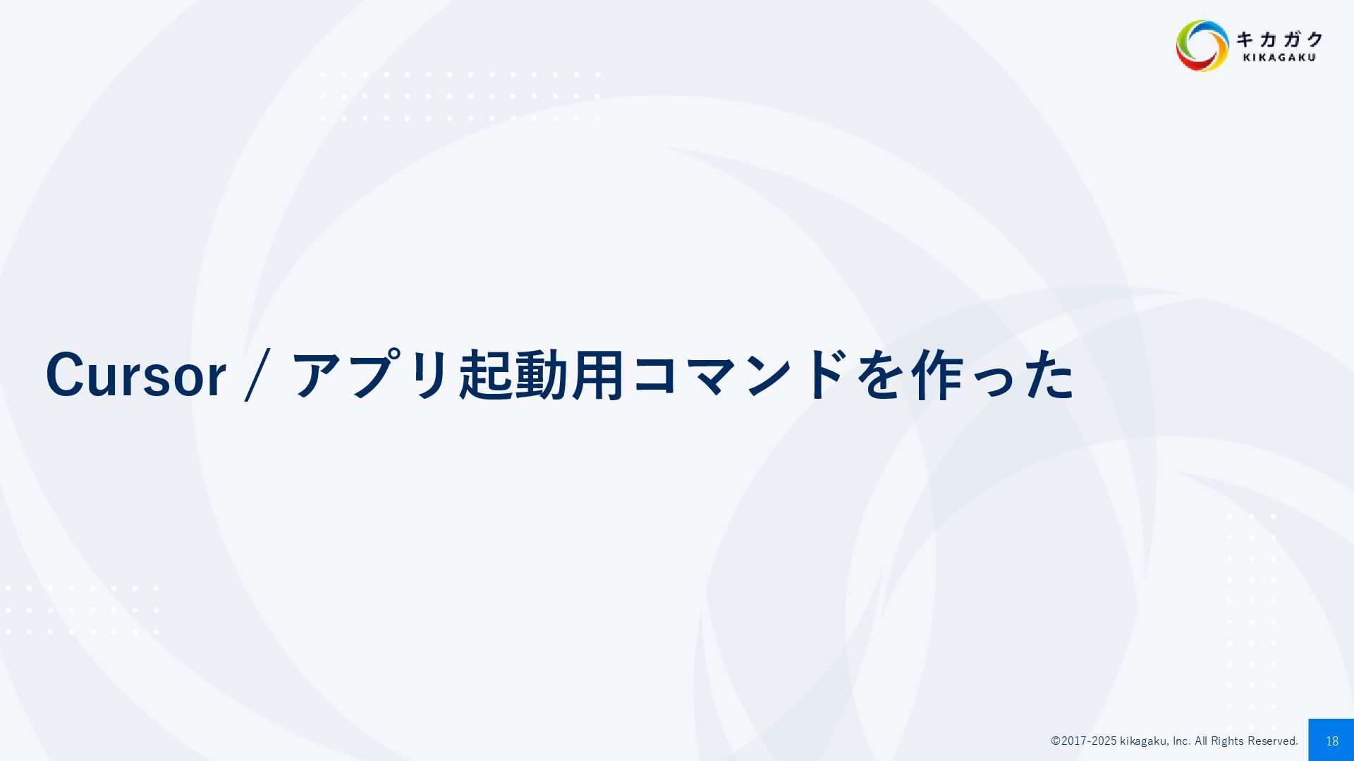 アプリ起動の際のトラブルは AI に全任せてもうまくいかないケースも多い ※ Docker アプリが立ち上がっているかなどは調査してくれない…。など → アプリを起動までの間に何かしら不測の自体が起きてもサポートしてくれるコマンドを作ろう。 ▪ アプリ起動用の Cursor コマンド爆誕 Cursor チャットで「/env_init」と入力するだけで… 1. Docker アプリが自動起動! 2. ターミナルアプリが自動起動! 3. ブランチが自動で最新化!(差分があれば stash) 4. FE, BE の両方が自動起動!(ポリレポにも対応) 5. 上記の手順でなにかトラブルがあれば自動で対応!