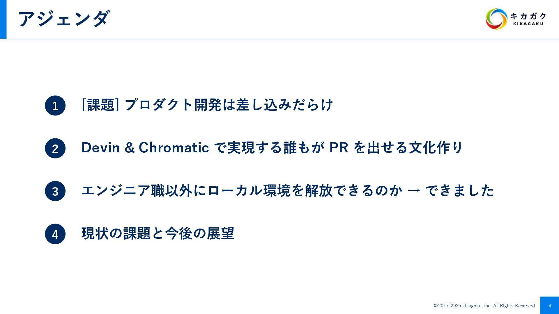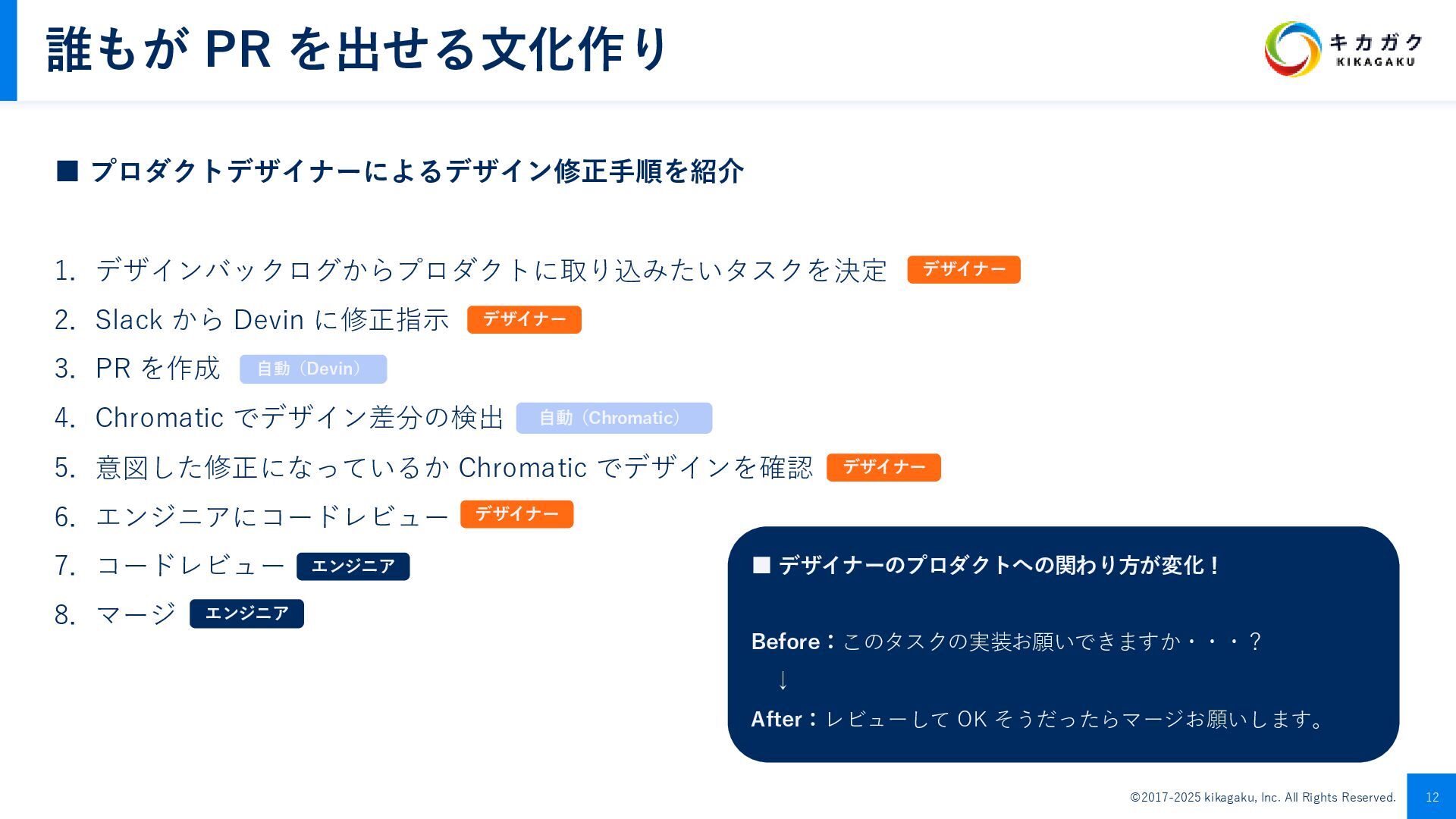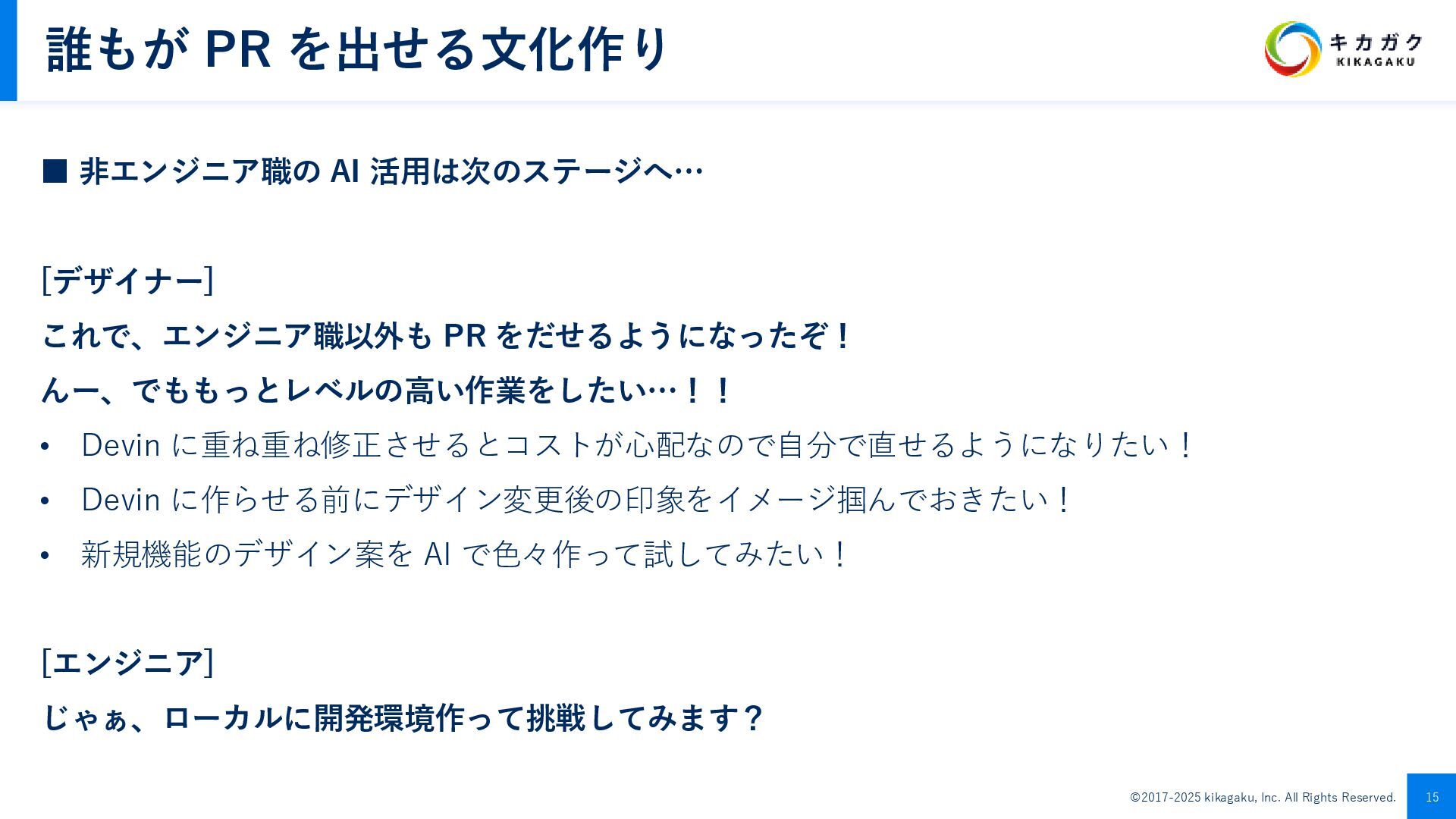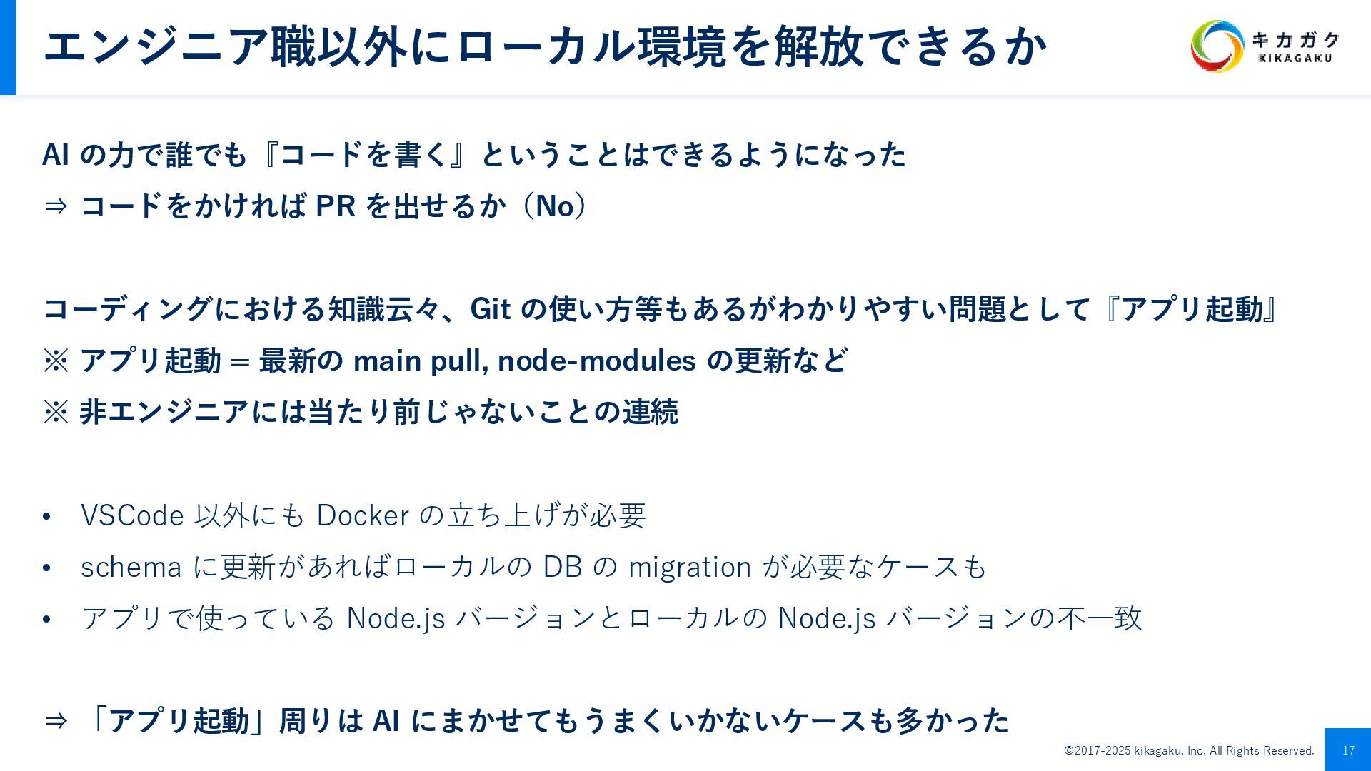 アプリ起動の際のトラブルは AI に全任せてもうまくいかないケースも多い ※ Docker アプリが立ち上がっているかなどは調査してくれない…。など → アプリを起動までの間に何かしら不測の自体が起きてもサポートしてくれるコマンドを作ろう。 ▪ アプリ起動用の Cursor コマンド爆誕 Cursor チャットで「/env_init」と入力するだけで… 1. Docker アプリが自動起動! 2. ターミナルアプリが自動起動! 3. ブランチが自動で最新化!(差分があれば stash) 4. FE, BE の両方が自動起動!(ポリレポにも対応) 5. 上記の手順でなにかトラブルがあれば自動で対応!