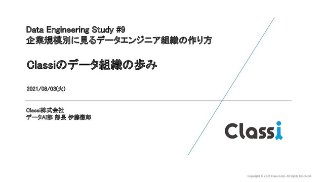 Study #9 企業規模別に見るデータエンジニア組織の作り方 2021/08/03(火) Classi株式会社 データAI部 部長 伊藤徹郎 Classiのデータ組織の歩み