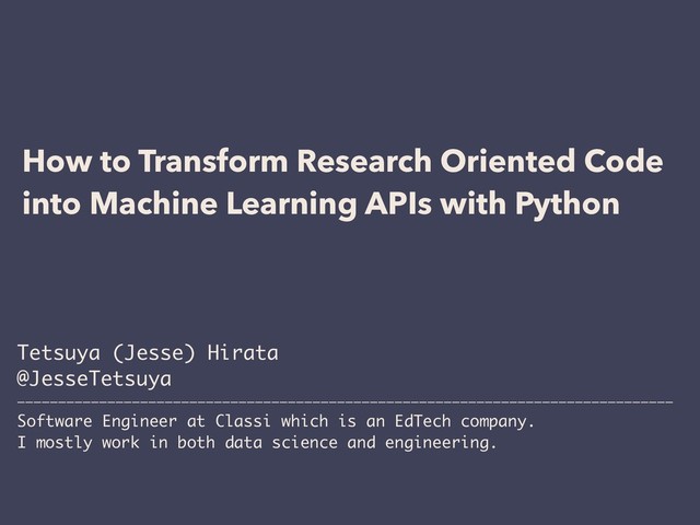 6OEFSTUBOE .PEVMBSJ[F  - What is Research Oriented Code ? - What are ML APIs - How should engineers handle research oriented code ? - Categorize research oriented code into preparation code, preprocessing code, ML code - Break them out into functions and make them testable - Clarify input and output of the code, and define URI - Prepare for refactoring - Simplify I/O in preparation code - Pandas → Python in preprocessing code - Write decorators to check parameters - Set up production-like environments
