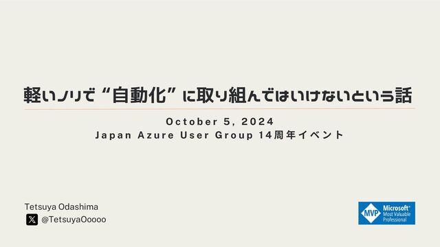 技術サポート/導入コンサル/人財育成 Microsoft MVP for Microsoft Azure (2018~) X @TetsuyaOoooo Qiita https://qiita.com/tetsuya-ooooo ET ソフトウェアデザインロボットコンテスト (ET ロボコン) 実行委員会 https://www.etrobo.jp/ 好きなこと ラジオを聴く、バイク、積みプラ