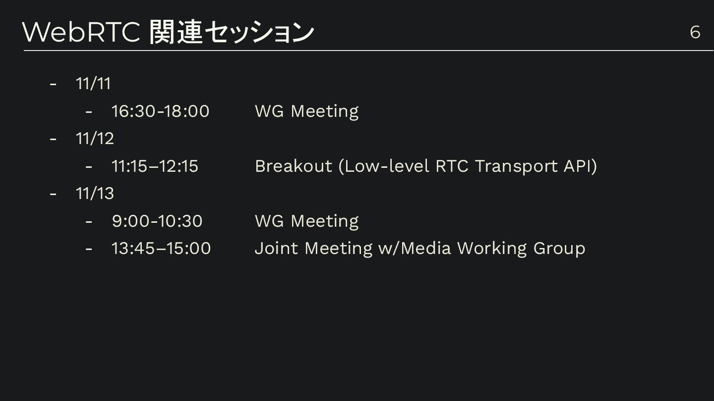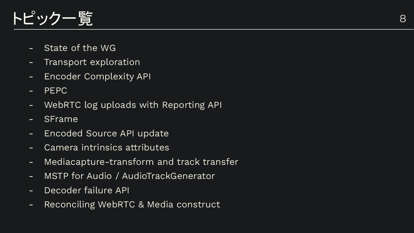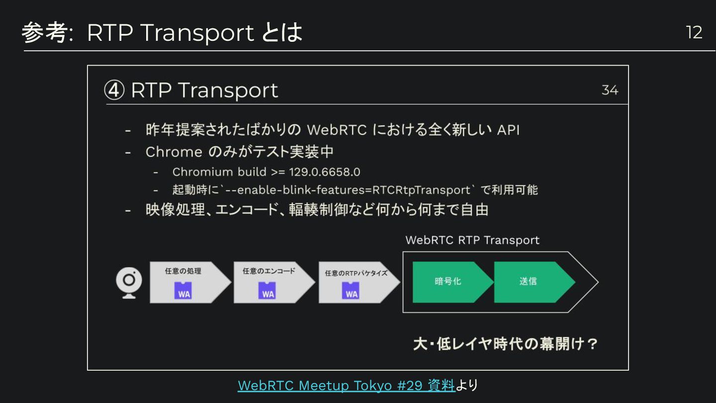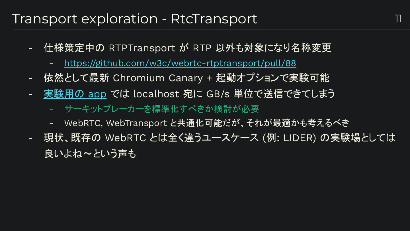 以外も対象になり名称変更 - https://github.com/w3c/webrtc-rtptransport/pull/88 - 依然として最新 Chromium Canary + 起動オプションで実験可能 - 実験用の app では localhost 宛に GB/s 単位で送信できてしまう - サーキットブレーカーを標準化すべきか検討が必要 - WebRTC, WebTransport と共通化可能だが、それが最適かも考えるべき - 現状、既存の WebRTC とは全く違うユースケース (例: LIDER) の実験場としては 良いよね〜という声も