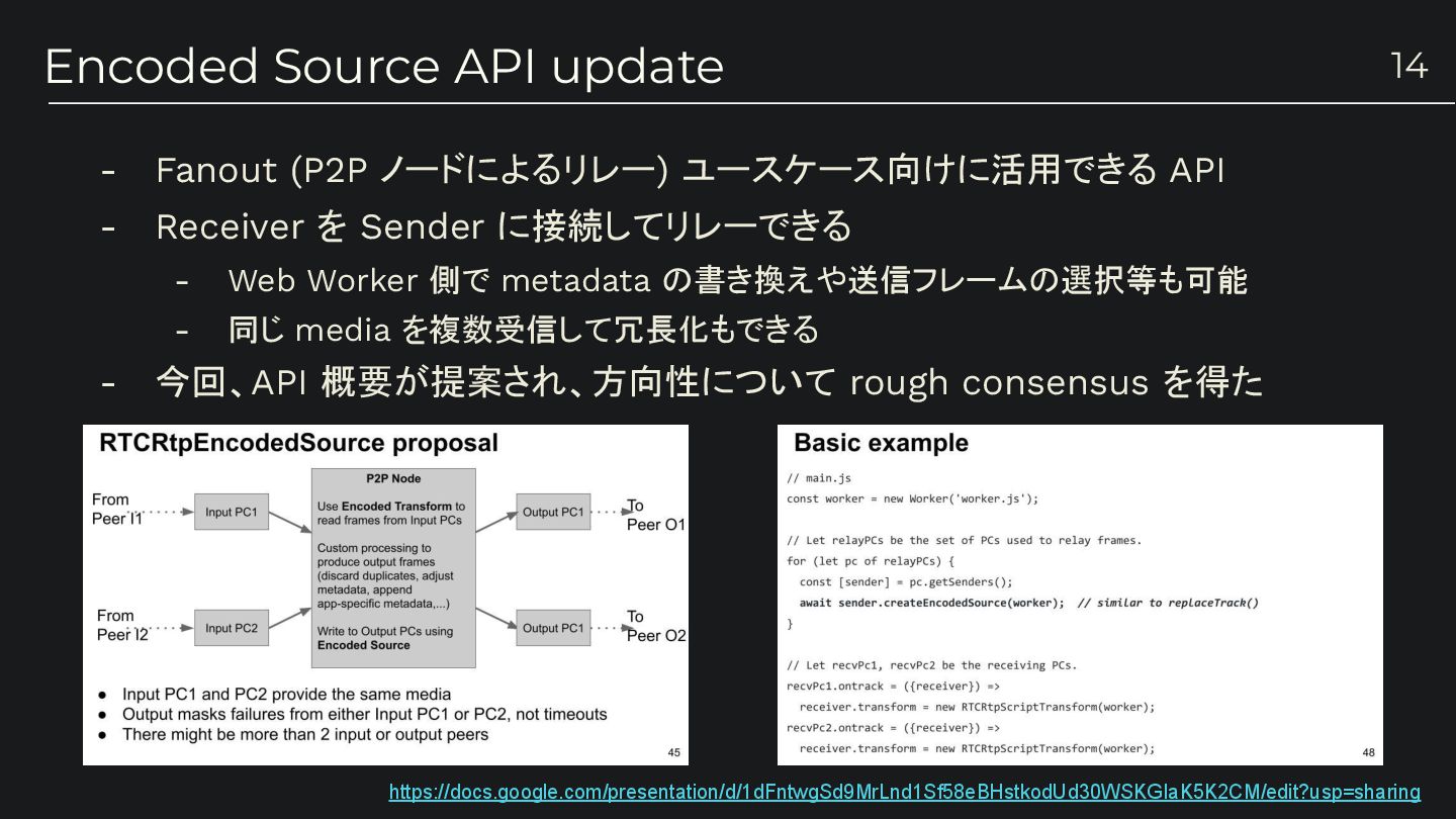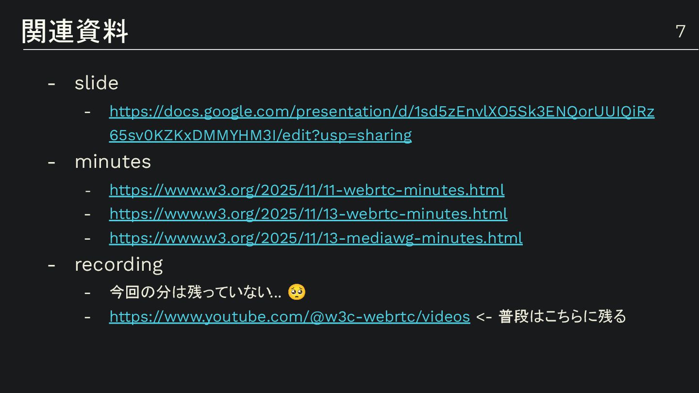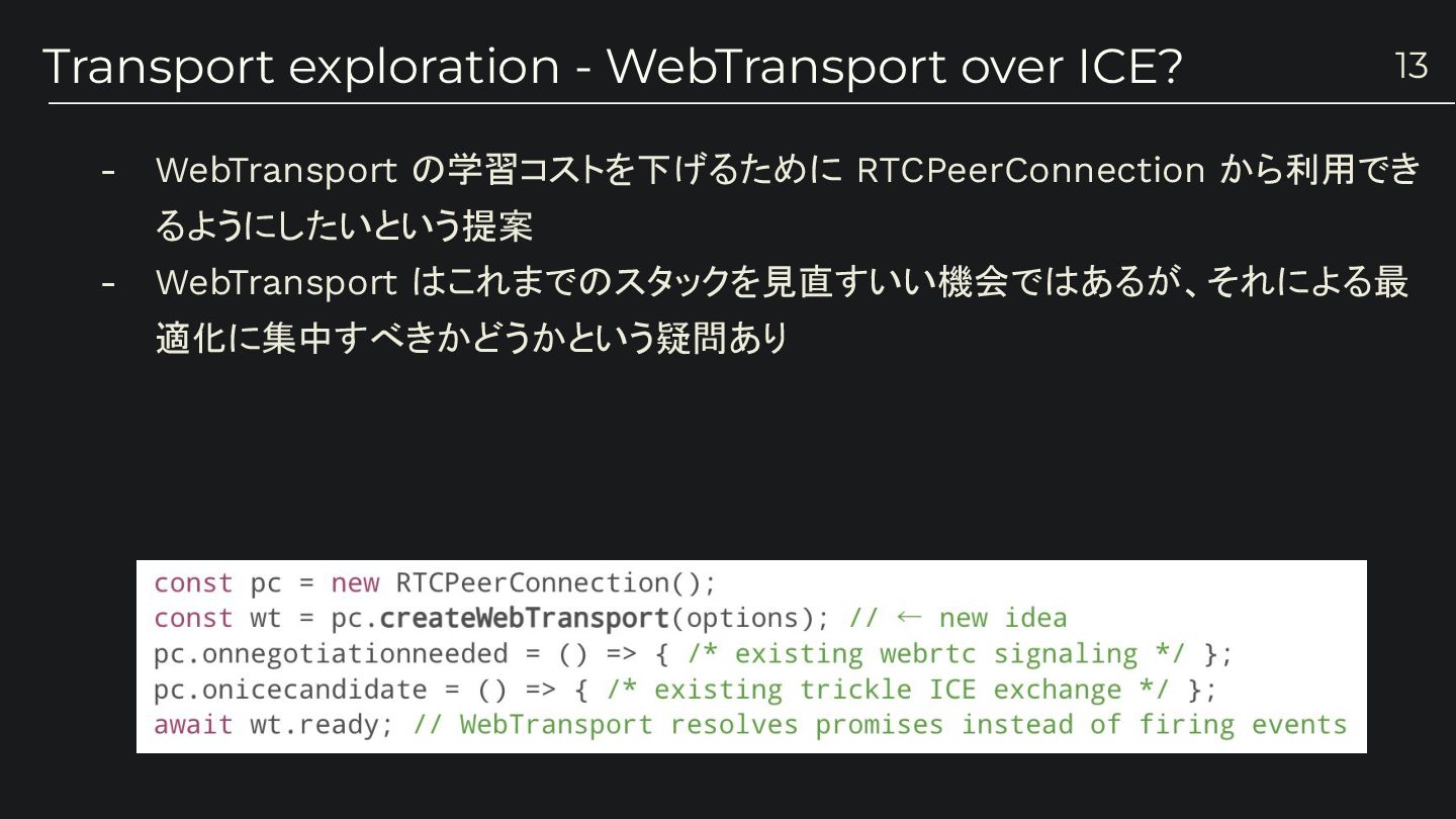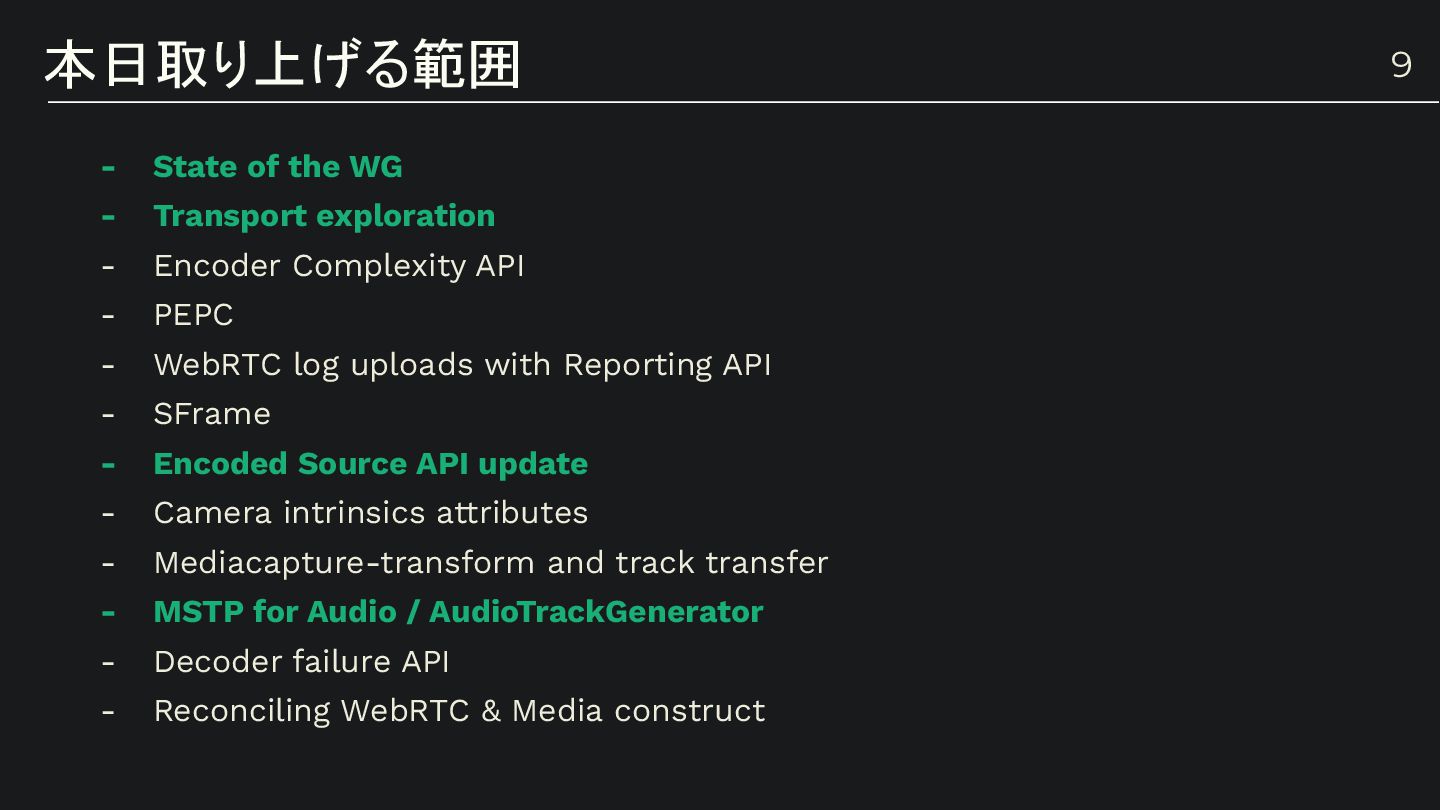 以外も対象になり名称変更 - https://github.com/w3c/webrtc-rtptransport/pull/88 - 依然として最新 Chromium Canary + 起動オプションで実験可能 - 実験用の app では localhost 宛に GB/s 単位で送信できてしまう - サーキットブレーカーを標準化すべきか検討が必要 - WebRTC, WebTransport と共通化可能だが、それが最適かも考えるべき - 現状、既存の WebRTC とは全く違うユースケース (例: LIDER) の実験場としては 良いよね〜という声も