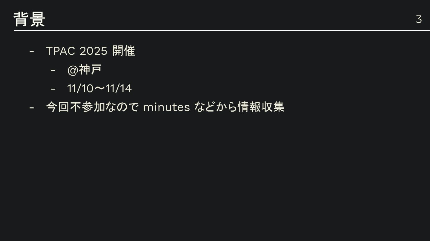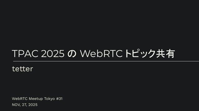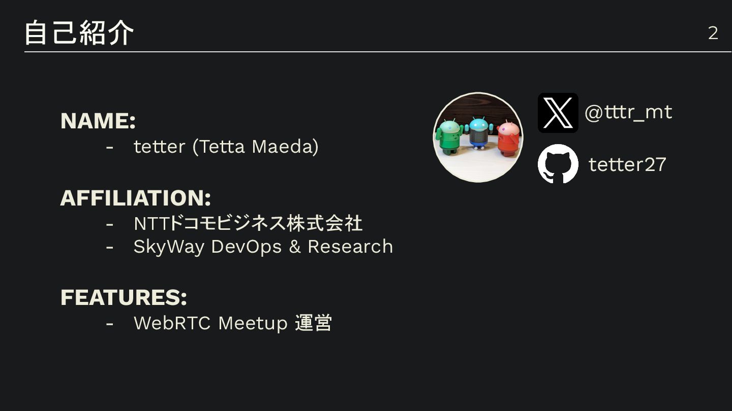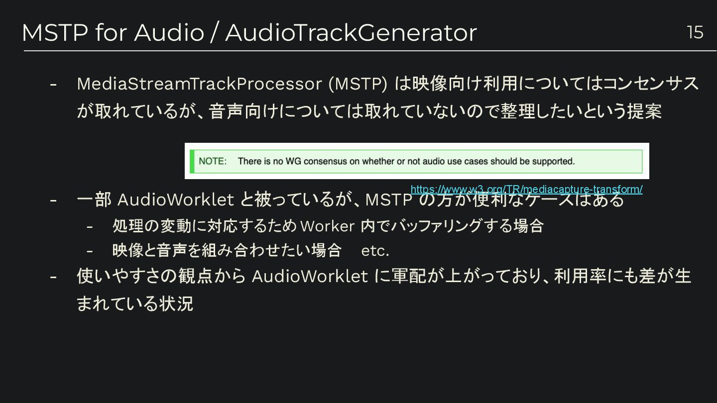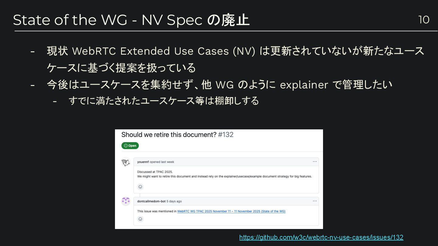 以外も対象になり名称変更 - https://github.com/w3c/webrtc-rtptransport/pull/88 - 依然として最新 Chromium Canary + 起動オプションで実験可能 - 実験用の app では localhost 宛に GB/s 単位で送信できてしまう - サーキットブレーカーを標準化すべきか検討が必要 - WebRTC, WebTransport と共通化可能だが、それが最適かも考えるべき - 現状、既存の WebRTC とは全く違うユースケース (例: LIDER) の実験場としては 良いよね〜という声も