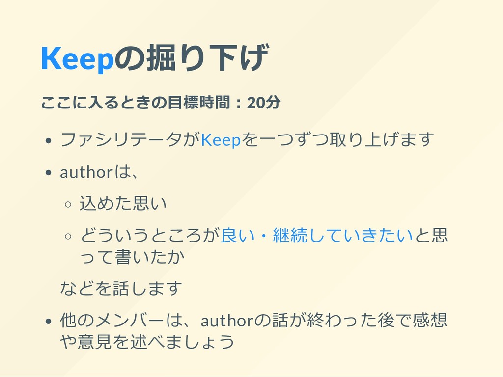 Keepの掘り下げ ここに⼊るときの⽬標時間︓20分 ファシリテータがKeepを⼀つずつ取り上げます authorは、 込めた思い どういうところが良い・継続していきたいと思 って書いたか などを話します 他のメンバーは、authorの話が終わった後で感想 や意⾒を述べましょう