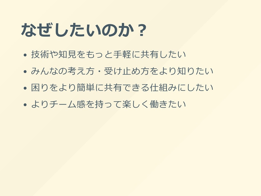 なぜしたいのか︖ 技術や知⾒をもっと⼿軽に共有したい みんなの考え⽅・受け⽌め⽅をより知りたい 困りをより簡単に共有できる仕組みにしたい よりチーム感を持って楽しく働きたい