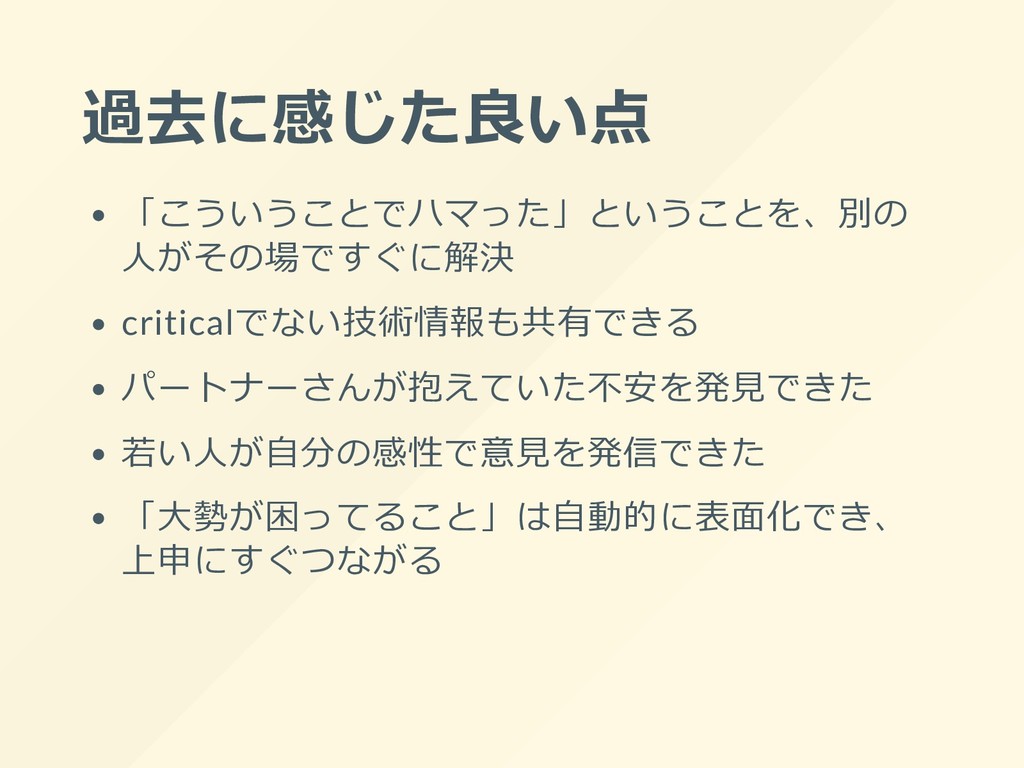 過去に感じた良い点 「こういうことでハマった」ということを、別の ⼈がその場ですぐに解決 criticalでない技術情報も共有できる パートナーさんが抱えていた不安を発⾒できた 若い⼈が⾃分の感性で意⾒を発信できた 「⼤勢が困ってること」は⾃動的に表⾯化でき、 上申にすぐつながる