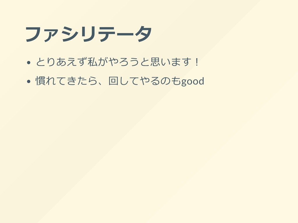 ファシリテータ とりあえず私がやろうと思います︕ 慣れてきたら、回してやるのもgood