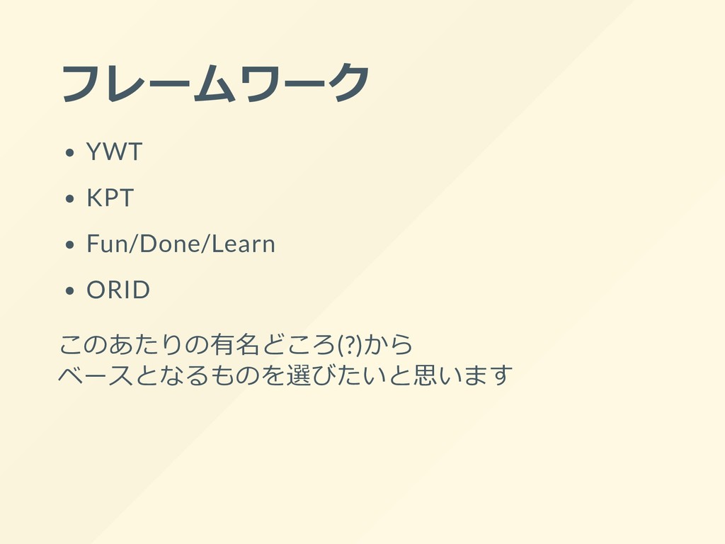 フレームワーク YWT KPT Fun/Done/Learn ORID このあたりの有名どころ(?)から ベースとなるものを選びたいと思います
