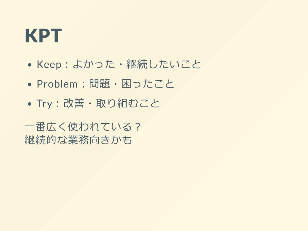 KPT Keep︓よかった・継続したいこと Problem︓問題・困ったこと Try︓改善・取り組むこと ⼀番広く使われている︖ 継続的な業務向きかも