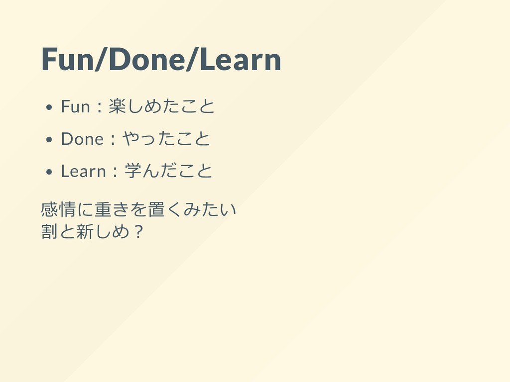 Fun/Done/Learn Fun︓楽しめたこと Done︓やったこと Learn︓学んだこと 感情に重きを置くみたい 割と新しめ︖