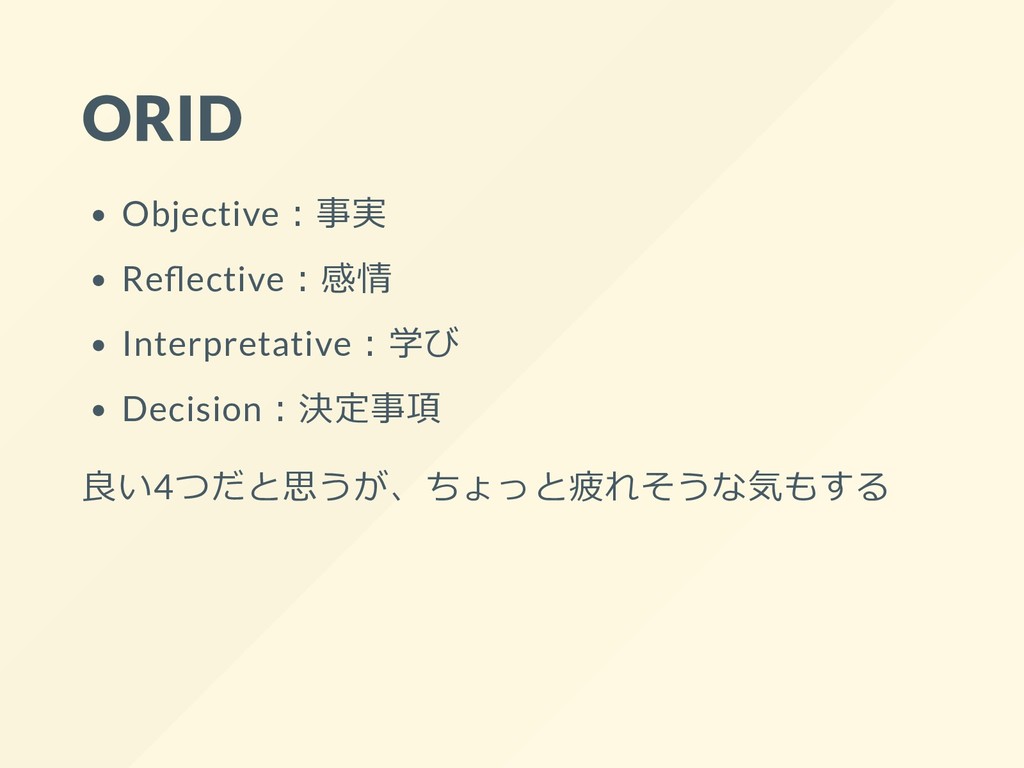 ORID Objective︓事実 Re ective︓感情 Interpretative︓学び Decision︓決定事項 良い4つだと思うが、ちょっと疲れそうな気もする