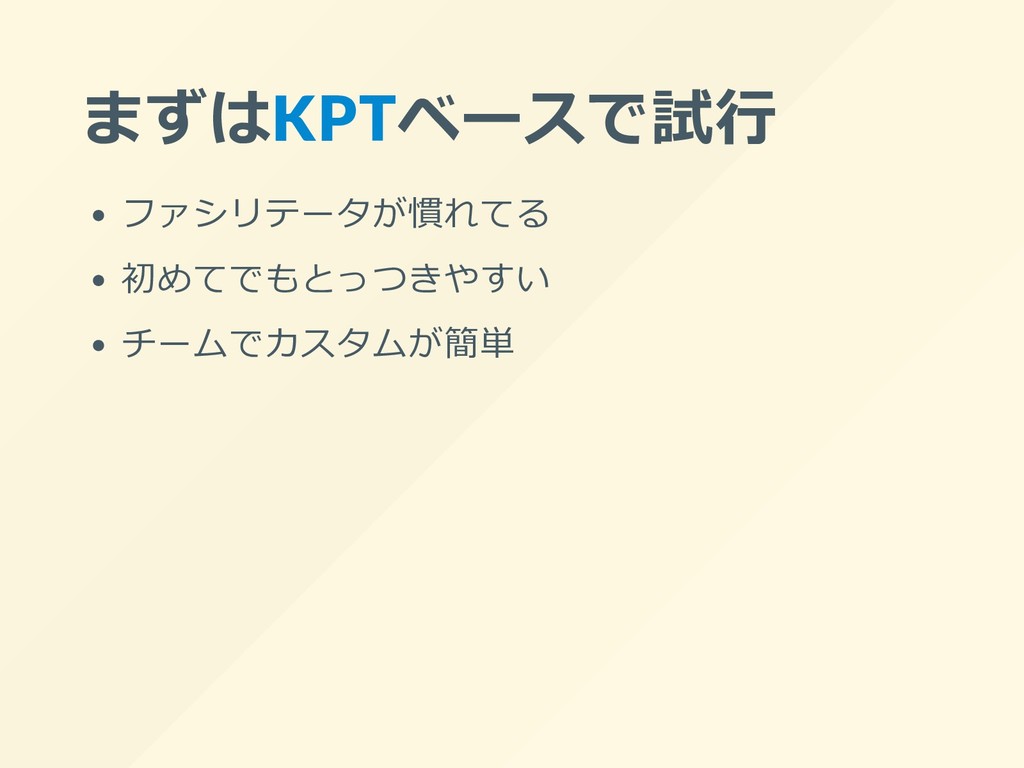 まずはKPTベースで試⾏ ファシリテータが慣れてる 初めてでもとっつきやすい チームでカスタムが簡単