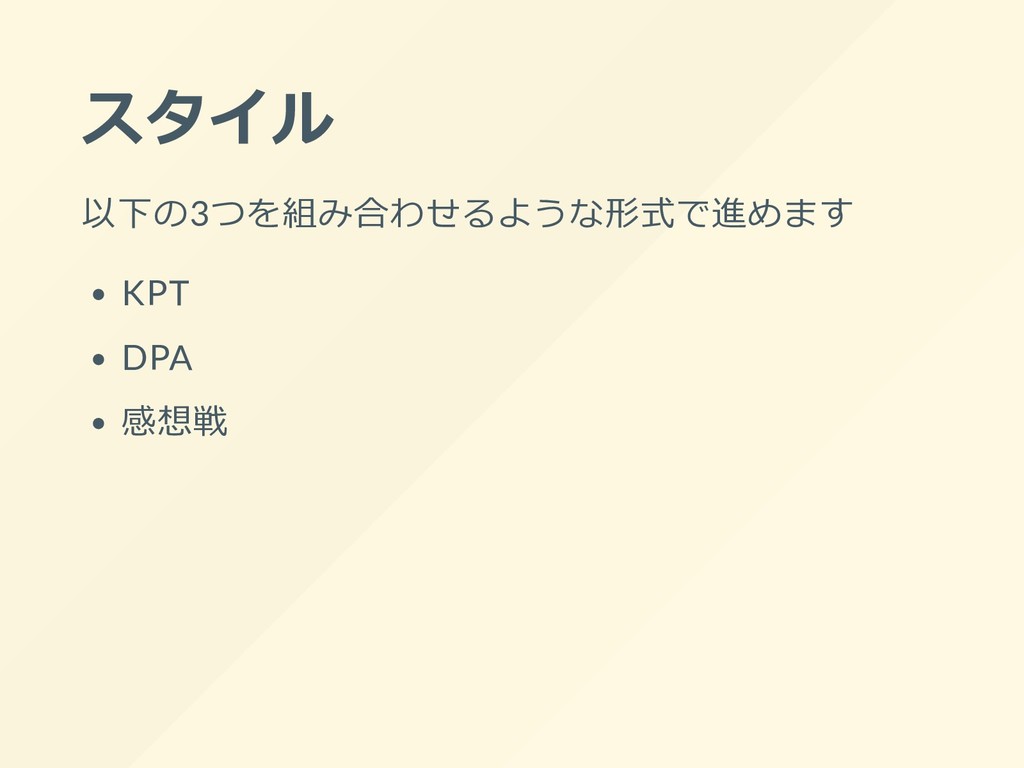 スタイル 以下の3つを組み合わせるような形式で進めます KPT DPA 感想戦