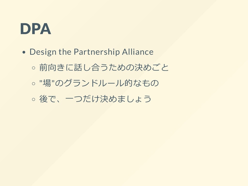 DPA Design the Partnership Alliance 前向きに話し合うための決めごと "場"のグランドルール的なもの 後で、⼀つだけ決めましょう