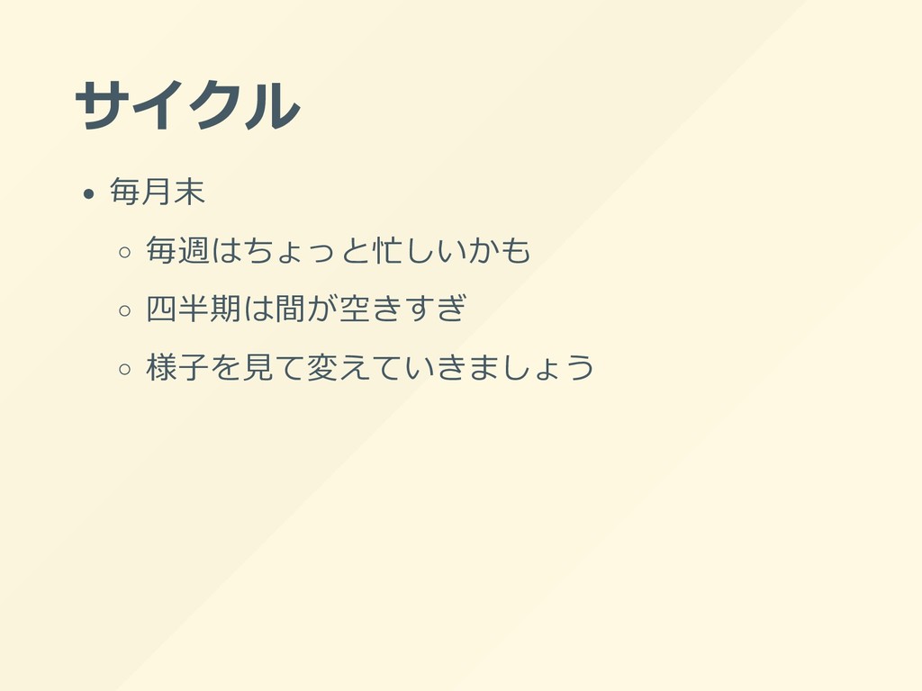 サイクル 毎⽉末 毎週はちょっと忙しいかも 四半期は間が空きすぎ 様⼦を⾒て変えていきましょう