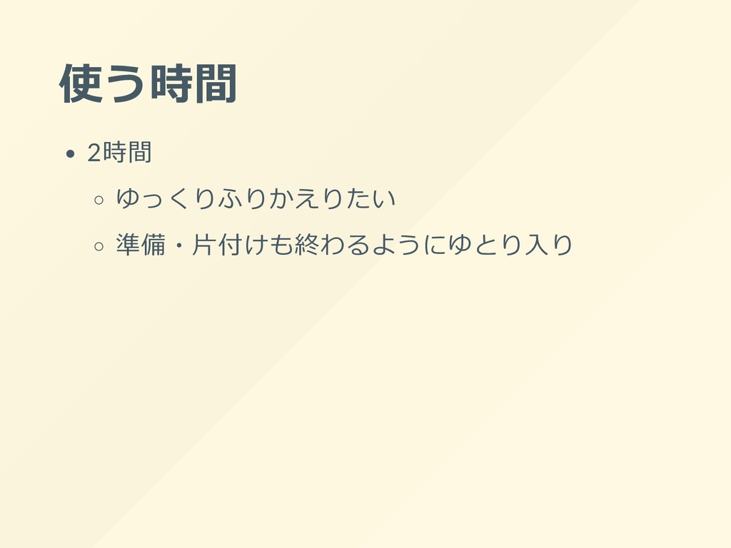 使う時間 2時間 ゆっくりふりかえりたい 準備・⽚付けも終わるようにゆとり⼊り