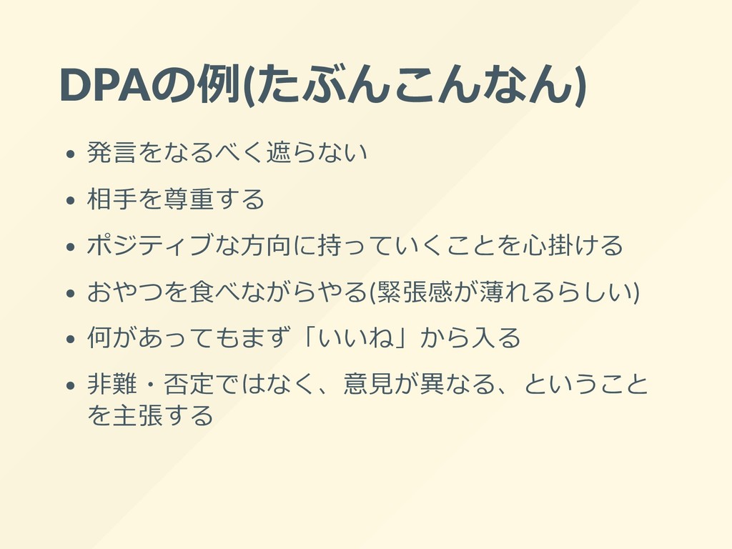 DPAの例(たぶんこんなん) 発⾔をなるべく遮らない 相⼿を尊重する ポジティブな⽅向に持っていくことを⼼掛ける おやつを⾷べながらやる(緊張感が薄れるらしい) 何があってもまず「いいね」から⼊る ⾮難・否定ではなく、意⾒が異なる、ということ を主張する