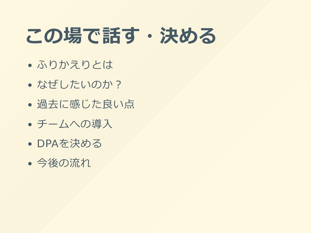 この場で話す・決める ふりかえりとは なぜしたいのか︖ 過去に感じた良い点 チームへの導⼊ DPAを決める 今後の流れ