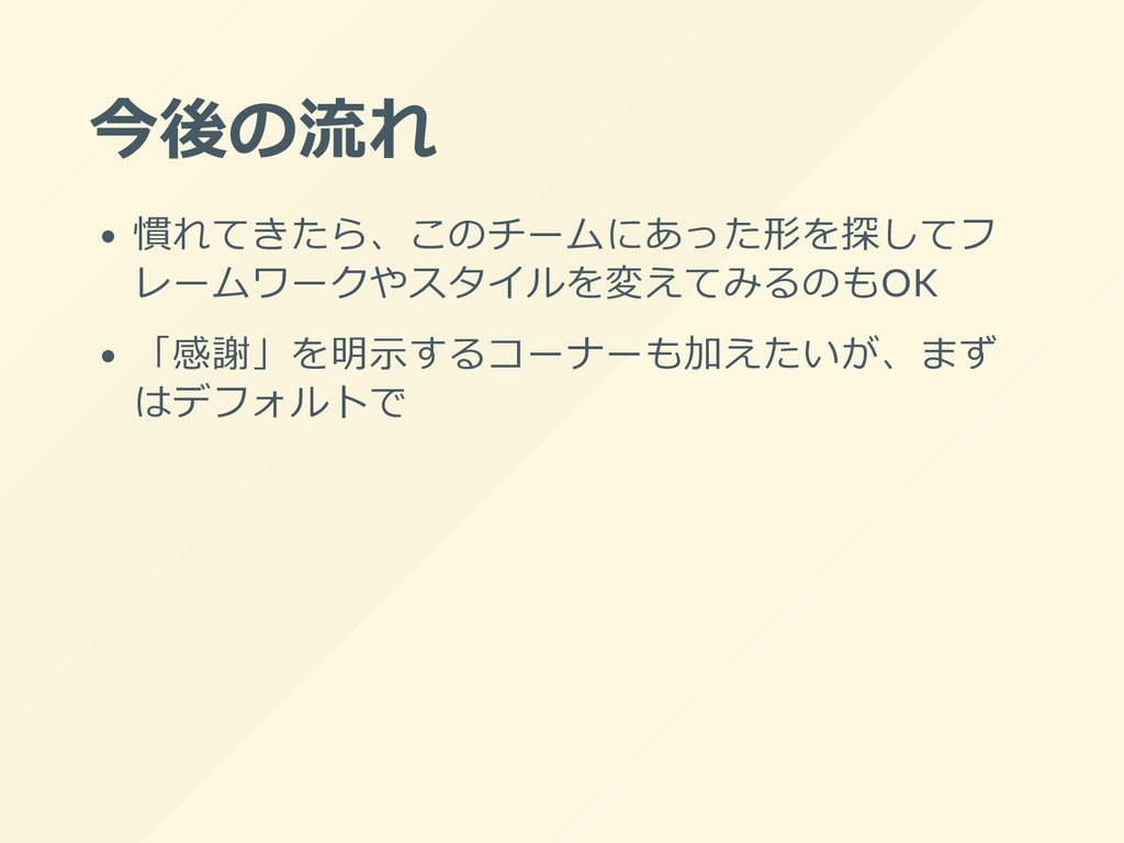 今後の流れ 慣れてきたら、このチームにあった形を探してフ レームワークやスタイルを変えてみるのもOK 「感謝」を明⽰するコーナーも加えたいが、まず はデフォルトで