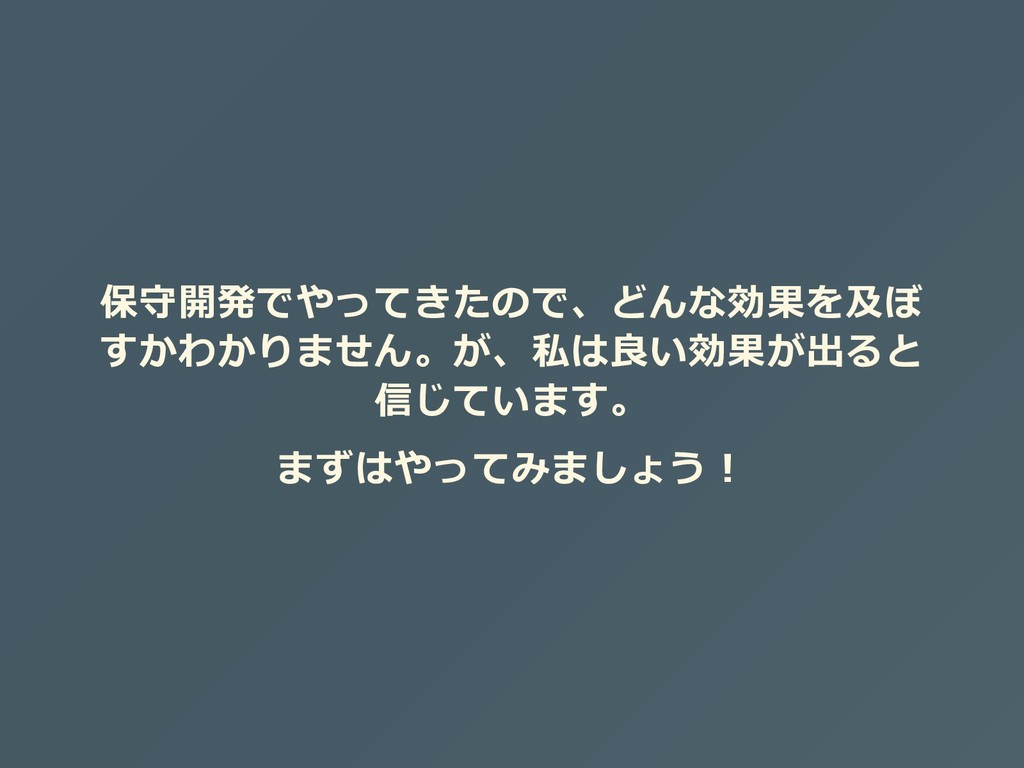 保守開発でやってきたので、どんな効果を及ぼ すかわかりません。が、私は良い効果が出ると 信じています。 まずはやってみましょう︕