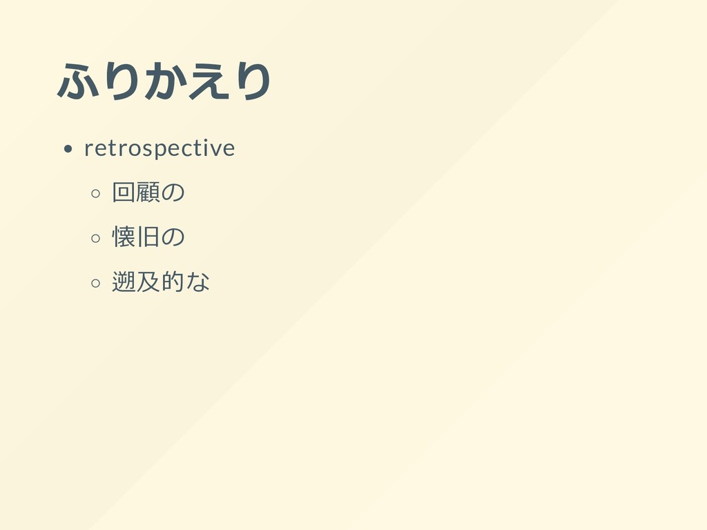 ふりかえり retrospective 回顧の 懐旧の 遡及的な