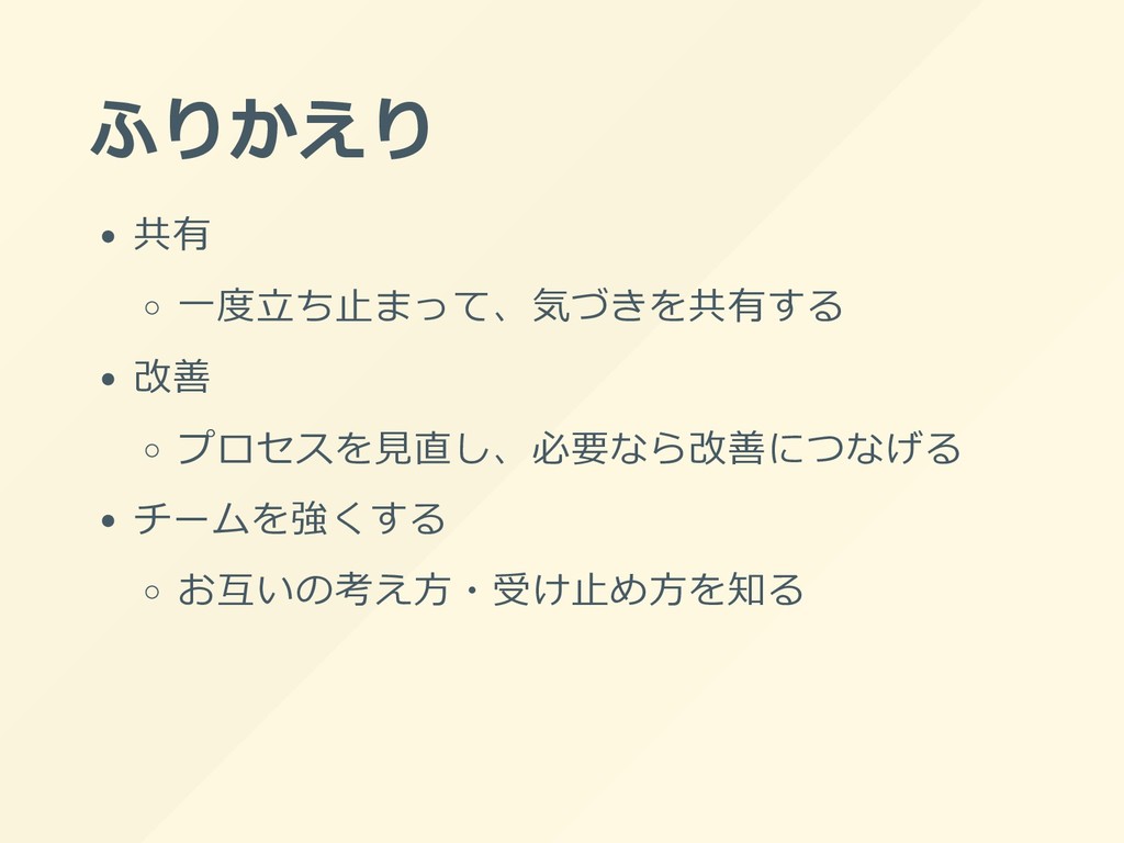 ふりかえり 共有 ⼀度⽴ち⽌まって、気づきを共有する 改善 プロセスを⾒直し、必要なら改善につなげる チームを強くする お互いの考え⽅・受け⽌め⽅を知る