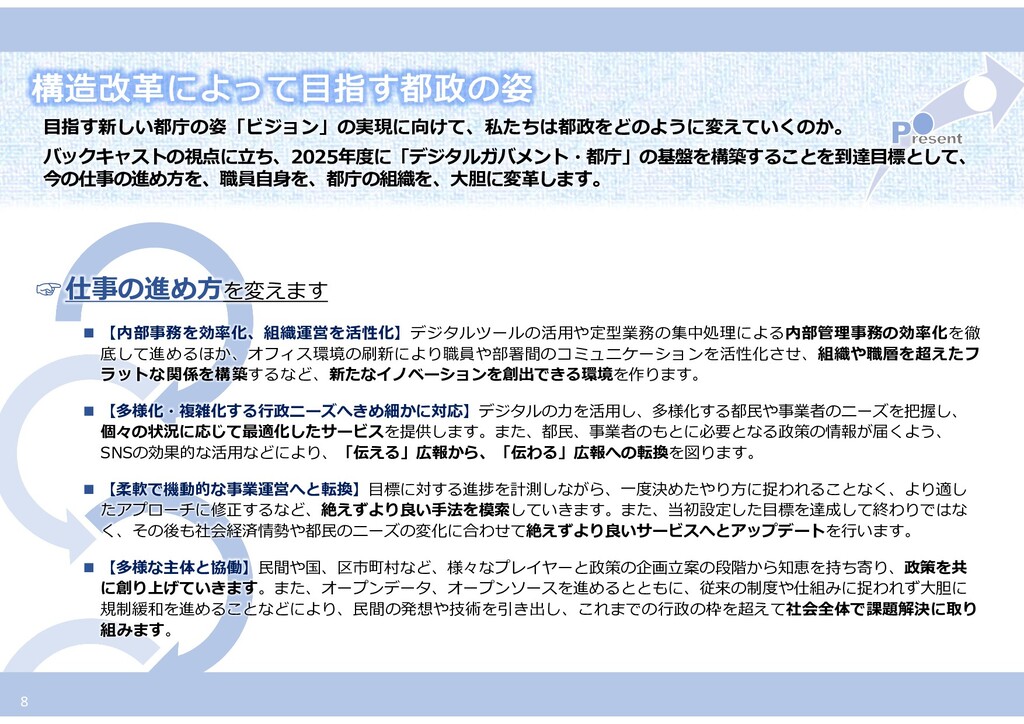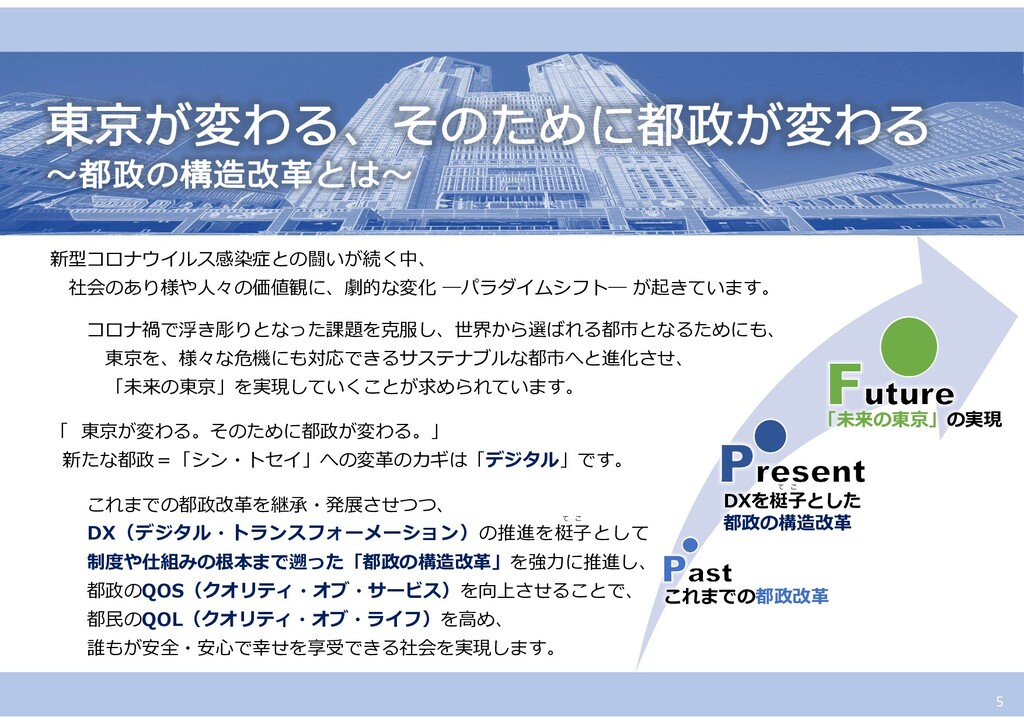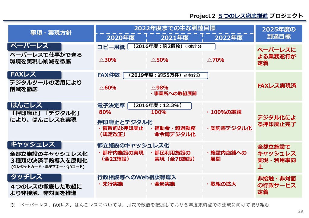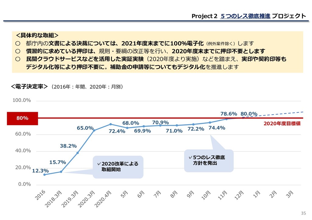 都民等からの申請・ 都民等への通知(行政手続等) 12,400 500 9,500 1,200 1,200 都の内部手続 2,600 400 2,000 0 200 都と他の行政機関等との手続 3,000 100 2,500 300 100 36 Project2 5つのレス徹底推進 プロジェクト <押印の見直し状況> 2020年12月末時点 廃止済 約1,000 デジタル化などにより廃止予定 約14,000 押印を要する事務件数 約18,000 法令等で規定あり 約1,500 表彰状など 約1,500 <押印を求めている事務の内訳> 2020年12月末時点 (単位:件)