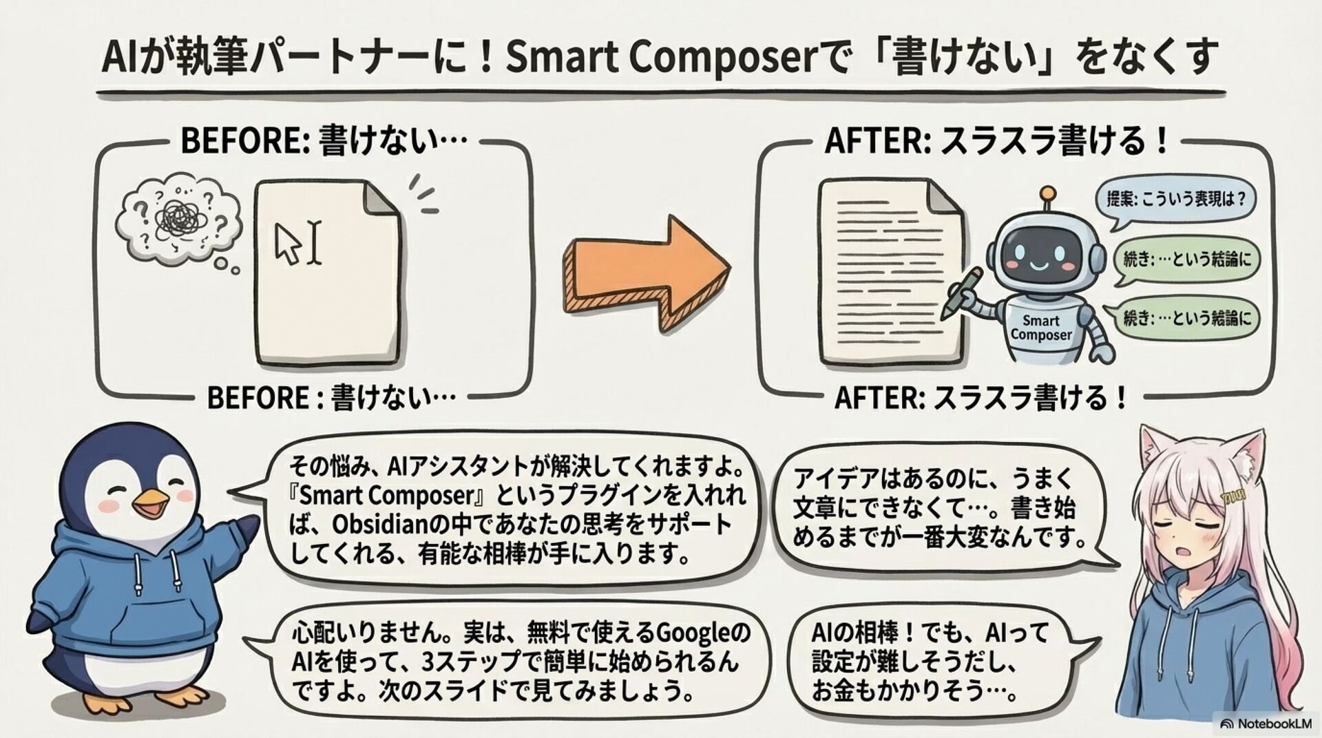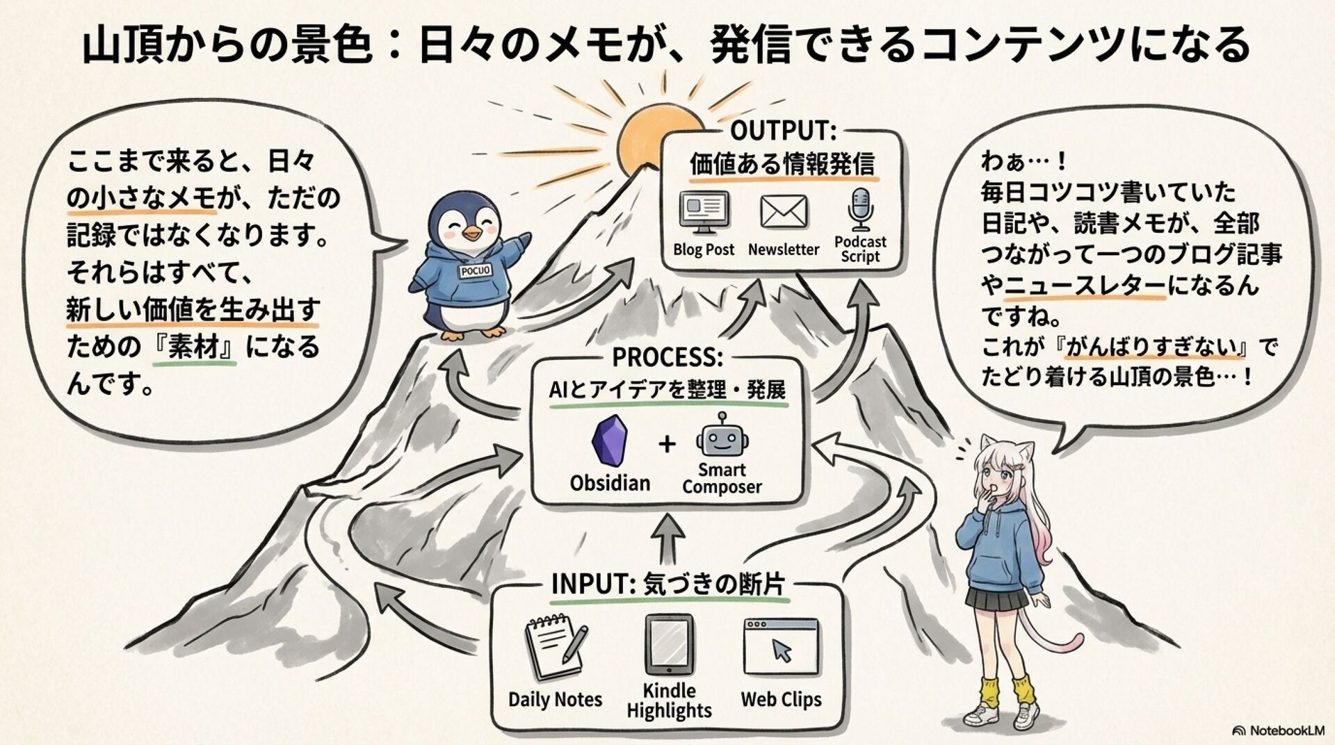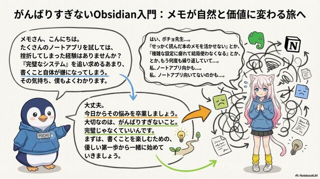「メモは取るけど活かせない」「設定で挫折した」そんな悩みを抱えるあなたへ。Obsidianを「がんばりすぎず」始めれば、日々のメモやKindleハイライトがAIの手助けで自然とブログ記事に成長します。難しい設定は不要、あなたの知識がすぐに発信力に変わる新時代の知的生産術を紹介します