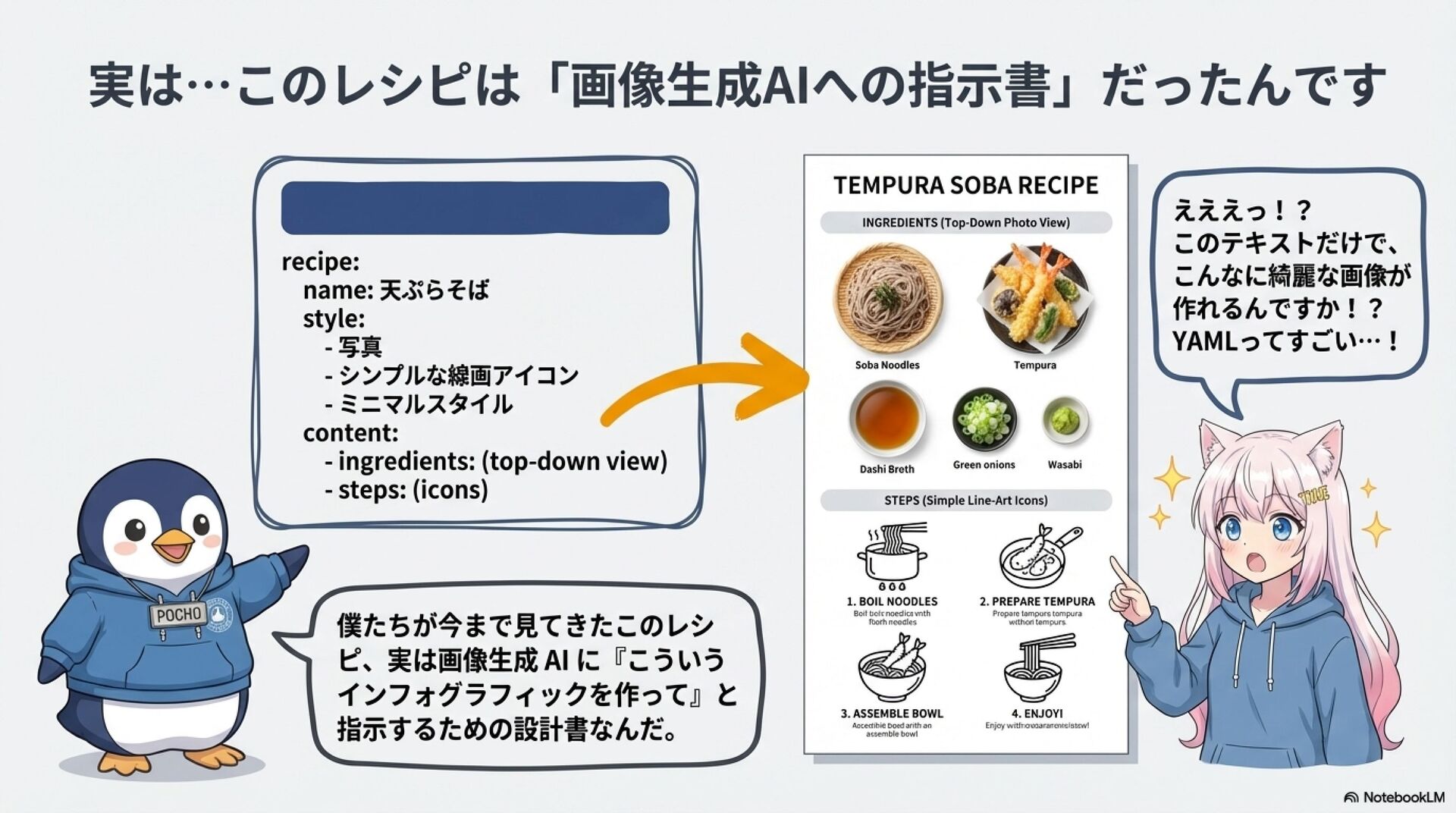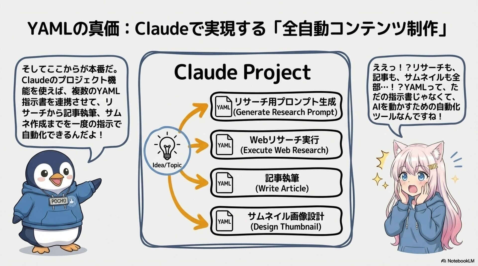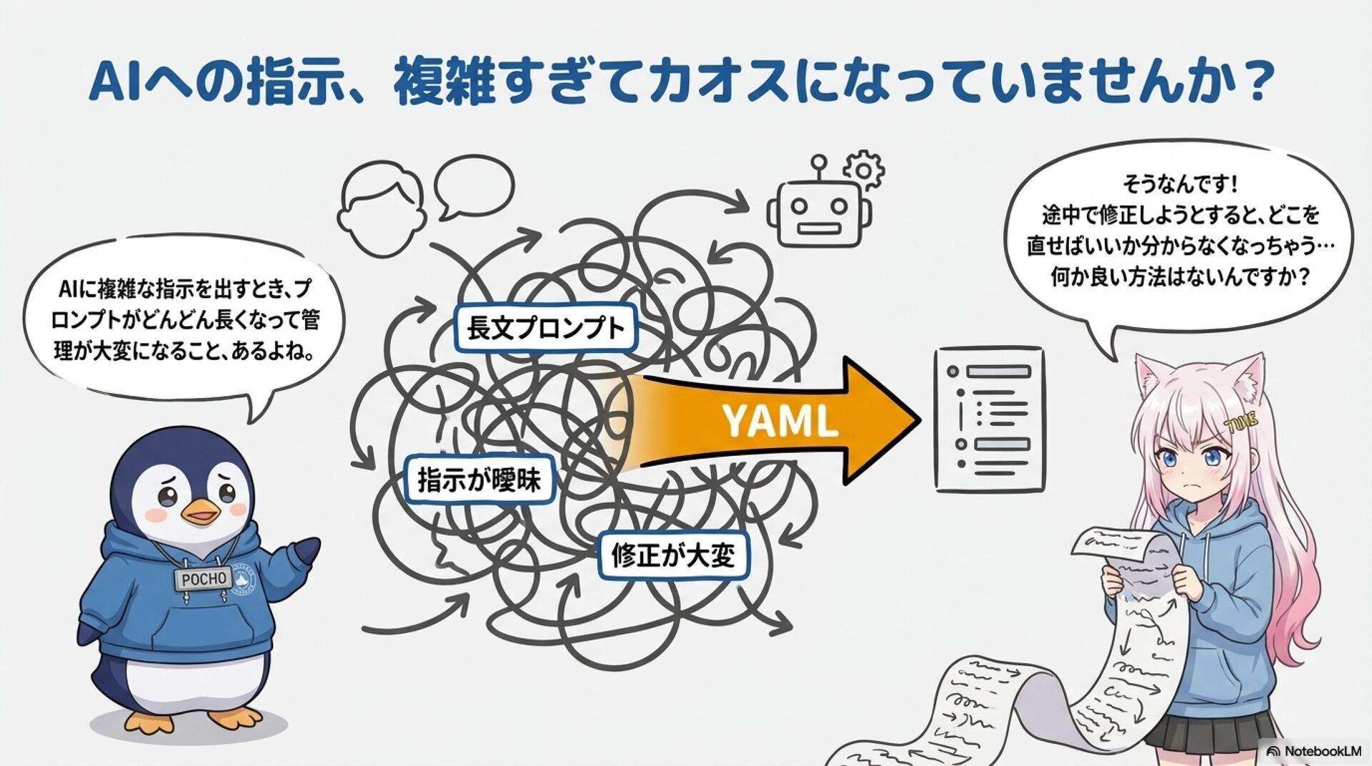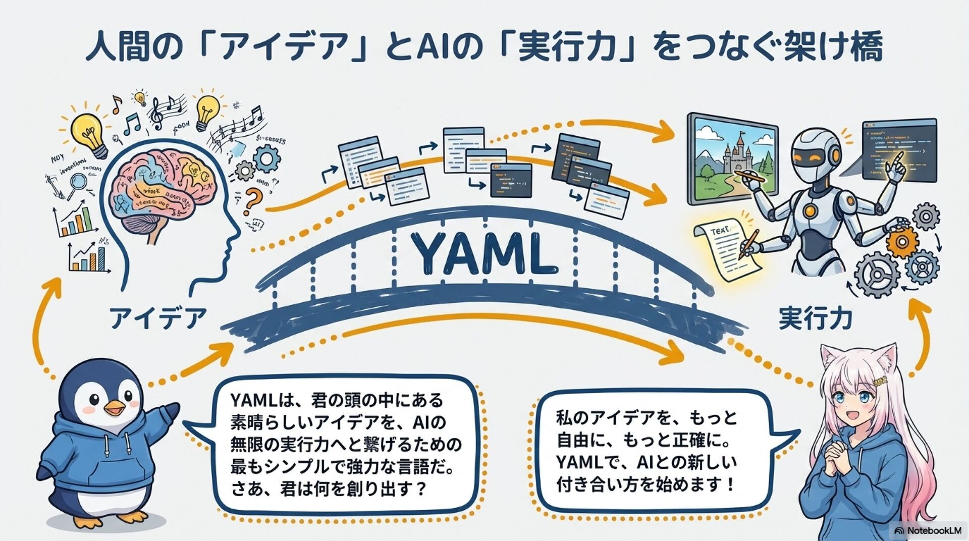 「この画像の構図だけ真似て内容を変えたい」「記事作成の手間を減らしたい」そんな願いを叶えるのがYAML形式です。プログラマーでなくても、YAML形式を使えば画像生成の指示を簡単にアレンジでき、さらにWebリサーチから記事執筆、サムネイル作成まで1回の指示で自動化できる驚きの技術を紹介します