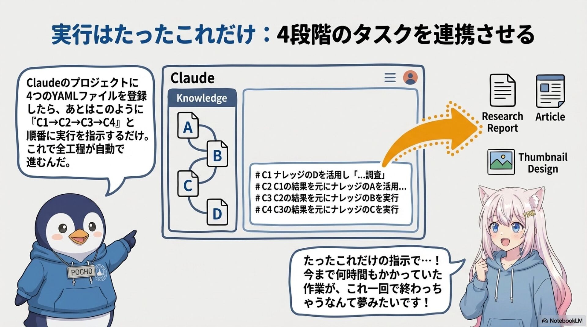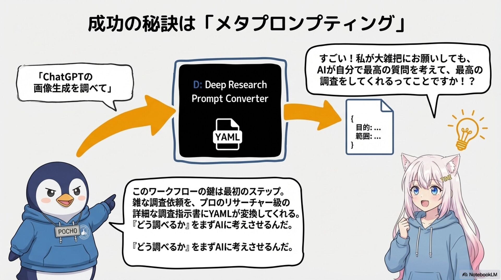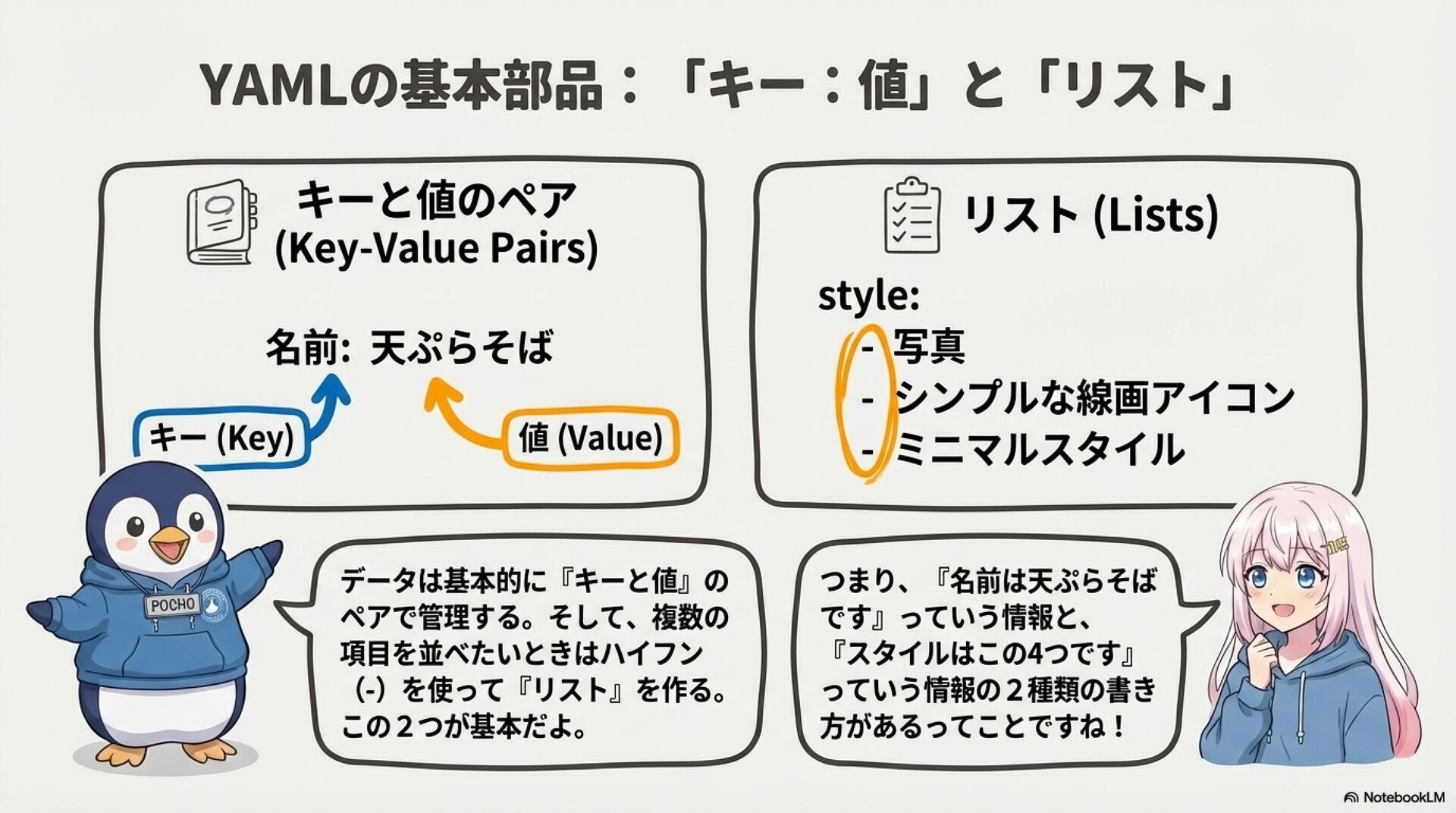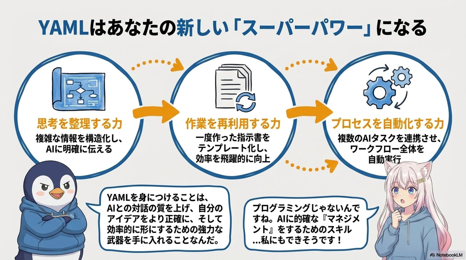 「この画像の構図だけ真似て内容を変えたい」「記事作成の手間を減らしたい」そんな願いを叶えるのがYAML形式です。プログラマーでなくても、YAML形式を使えば画像生成の指示を簡単にアレンジでき、さらにWebリサーチから記事執筆、サムネイル作成まで1回の指示で自動化できる驚きの技術を紹介します
