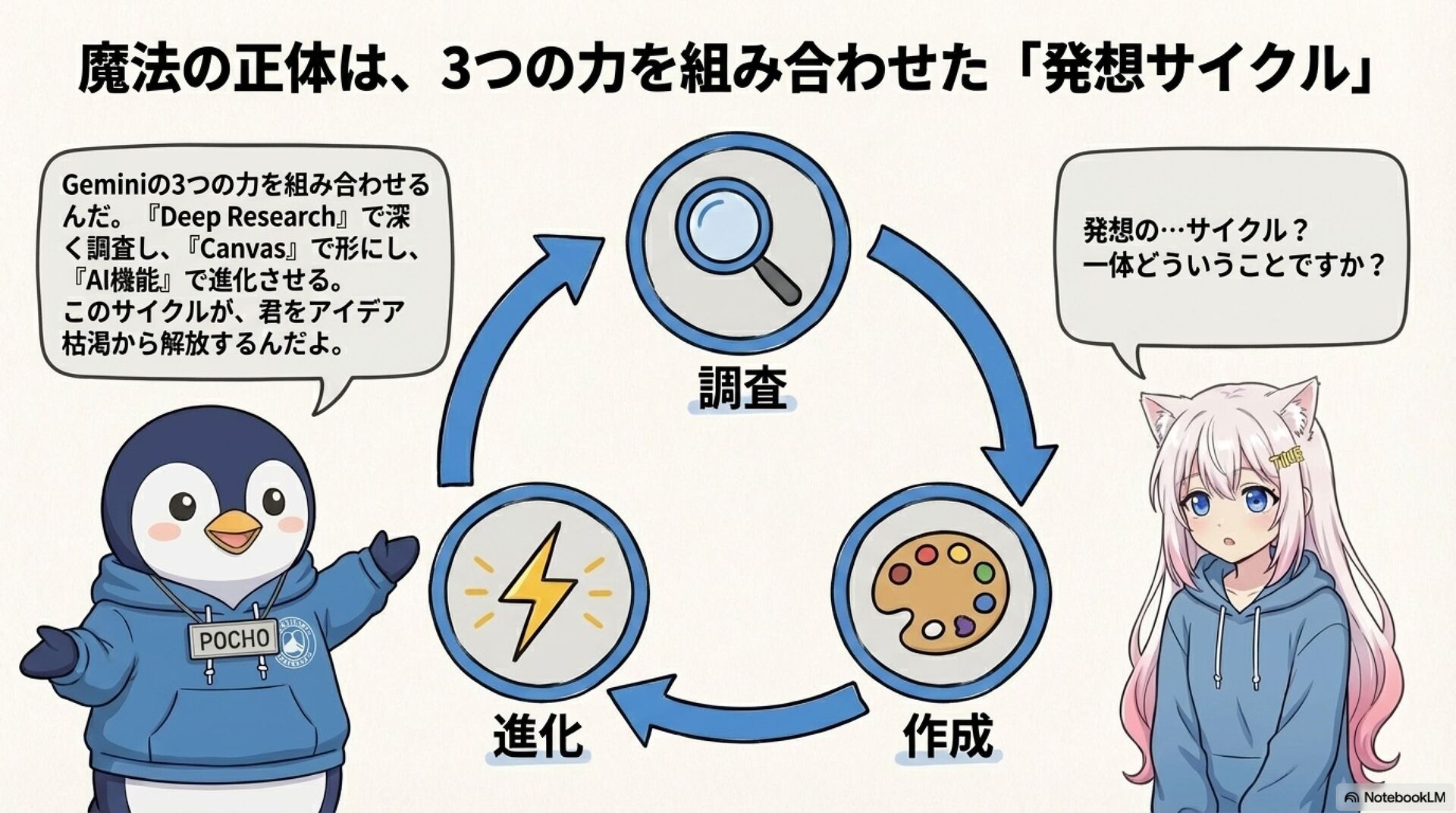 「アイデアが枯渇した...」って絶望、実は簡単に解決できるんです。GeminiのDeep Research(調査革命)、Canvas(創作支援)、AI機能追加(無限進化)という3つの基本機能から、クリエイターの永遠の悩みを根本解決する応用術まで、ちょっとディープに、でもゆるく解説します