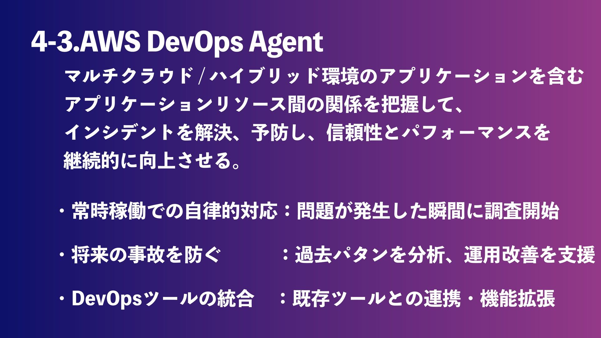 "84%FW0QT"HFOU ϚϧνΫϥυϋΠϒϦουڥͷΞϓϦέʔγϣϯΛؚΉ ΞϓϦέʔγϣϯϦιʔεؒͷؔΛѲͯ͠ɺ ΠϯγσϯτΛղܾɺ༧͠ɺ৴པੑͱύϑΥʔϚϯεΛ ܧଓతʹ্ͤ͞Δɻ ɾৗ࣌ՔಇͰͷࣗతରԠɿ͕ൃੜͨ͠ॠؒʹௐࠪ։࢝ ɾকདྷͷࣄނΛ͙ɹɹɿաڈύλϯΛੳɺӡ༻վળΛࢧԉ ɾ%FW0QTπʔϧͷ౷߹ɹɿطଘπʔϧͱͷ࿈ܞɾػೳ֦ு