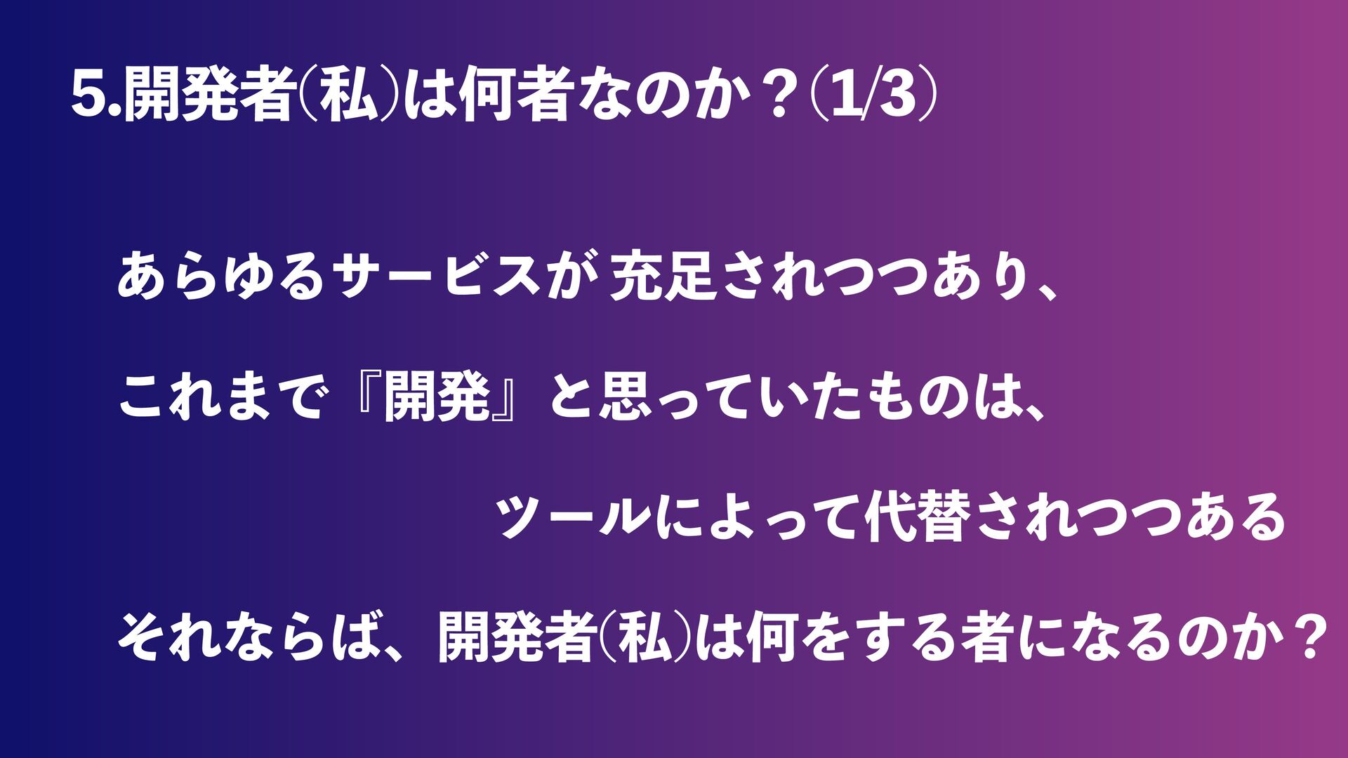 ͋ΒΏΔαʔϏε͕ॆ͞Εͭͭ͋Γɺ ͜Ε·Ͱʰ։ൃʱͱࢥ͍ͬͯͨͷɺ ɹɹɹɹɹɹɹπʔϧʹΑͬͯସ͞Εͭͭ͋Δ ͦΕͳΒɺ։ൃऀ ࢲ ԿΛ͢ΔऀʹͳΔͷ͔ʁ ։ൃऀ ࢲ Կऀͳͷ͔ʁ