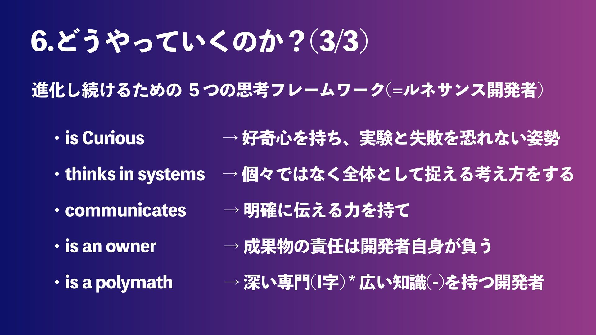 ਐԽ͠ଓ͚ΔͨΊͷ̑ͭͷࢥߟϑϨʔϜϫʔΫ ϧωαϯε։ൃऀ ɹ ɹɾJT$VSJPVTɹɹɹɹˠح৺Λ࣋ͪɺ࣮ݧͱࣦഊΛڪΕͳ͍࢟ ɹɾUIJOLTJOTZTUFNTɹˠݸʑͰͳ͘શମͱͯ͠ଊ͑Δߟ͑ํΛ͢Δ ɹɾDPNNVOJDBUFTɹɹˠ໌֬ʹ͑ΔྗΛ࣋ͯ ɹɾJTBOPXOFSɹɹɹɹˠՌͷ։ൃऀ͕ࣗෛ͏ ɹɾJTBQPMZNBUIɹɹɹˠਂ͍ઐ *ࣈ
