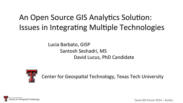 GIS Analy5cs Solu5on: Issues in Integra5ng Mul5ple Technologies Lucia Barbato, GISP Santosh Seshadri, MS David Lucus, PhD Candidate Center for Geospa5al Technology, Texas Tech University