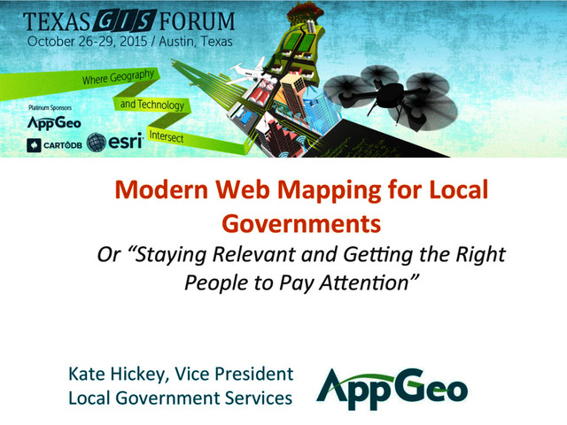 Economic Development & Growth GIS speak: “Users can now download all or a filtered subset of our data, access GeoJSON services, or query our standards-‐compliant catalog.” Leadership speak: “Open Data feeds our growing tech hub – a8rac9ng new, innova9ve technology-‐based companies to our City.”