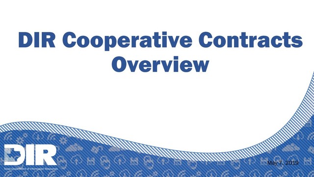 Resources (DIR) provides technology leadership, solutions, and value to Texas state government, education, and local government entities to facilitate the fulfillment of their core missions. DIR fulfills its mission through: Adopting statewide technology rules and standards that contribute to effective enterprise management of technology resources Effective planning, implementation and management of statewide technology infrastructure that supports agencies’ business operations Pooling the purchasing power of government and leveraging it to drive down costs and add value to information technology (IT) purchases for state government entities 5/7/2019