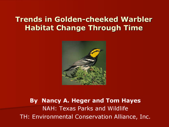 presence-absence of the endangered golden-cheeked warbler (Dendroica chrysoparia). Southwestern Naturalist 51:181-190. Diamond, D. D. 2007. Range-wide modeling of Golden-cheeked warbler habitat. Unpublished report to TPWD. Columbia, Missouri : University of Missouri. Loomis Austin. 2008. Mapping potential golden-cheeked warbler breeding habitat using remotely sensed forest canopy cover data. Report LAI Project No. 051001. Austin, TX: Loomis Austin. Magness, D. R., Wilkins, R. N. & Hejl, S. J. 2006. Quantitative relationships among golden-cheeked warbler occurrence and landscape size, composition, and structure. Wildlife Society Bulletin 34:473-479. Morrison M. L., R. N. Wilkins, B. A. Collier, J. E.Groce, H. A. Mathewson, T. M. McFarland, A. G. Snelgrove, R. T. Snelgrove, and K. L. Skow. 2010. Golden-cheeked warbler population distribution and abundance. College Station, TX: Texas A&M Institute of Renewable Natural Resources. GCWA Photo source: U.S. Fish and Wildlife Service
