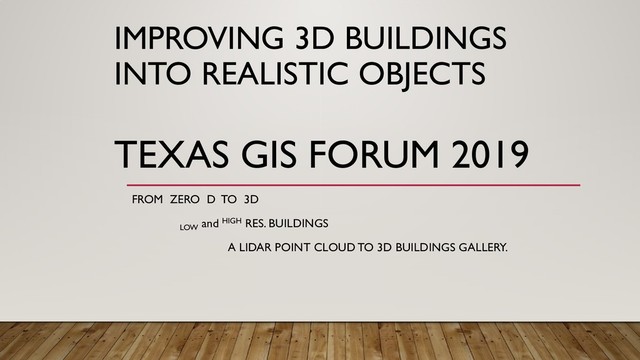 “buildings” as one of the classifications of the point cloud (LP360) 2. Create building footprint polygons (LP360) 3. If Digital Elevation Model is not available create it using “ground” classified points (LP360) 4. Create a Digital Surface Model using “ground” and “building” classified points (LP360) 5. Create a new raster mosaic for DEM if DEM tiles available from vendor (ArcGIS Pro) 6. Create a normalized Digital Surface Model (nDSM) subtracting the DEM from the DSM to get object heights (ArcMap or ArcGIS Pro) 7. a) Low-res version: using DEM, DSM, nDSM and building footprints extract the roof forms for buildings and Create 3D buildings (ArcGIS Pro) or b) High-res. using lidar cloud and footprints create 3D multipatch building 8. Enable and symbolize 3D buildings in a 3D Scene (ArcGIS Pro) 9. Review buildings and QA/QC the attributes, fix incorrect roof forms (ArcGIS Pro) 10. Next Steps