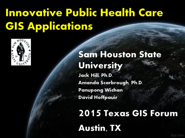 education in the Health Sciences and Medical Training • SHSU (1879) - Established to improve higher education, including expanding Health Sciences and Medical Training • Team Goals: • Create informed, healthy, and thriving communities • Dedicated to building a Health Science Program to create the workforce • Appreciate the benefits of a formal long-term and mutually beneficial collaboration in Health Care • To start – jointly develop a GIS focused health care pilot project to attract additional funding for an operational system