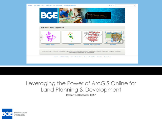 – Learn how BGE services connect, establish groups and view content via ArcGIS Online • Land Planning and Development Issues: – Communication, – Marketing, – Basic map viewing • ArcGIS Online Solution – Easy to use and viewed on any OS – Easy to tracks current and future potential projects