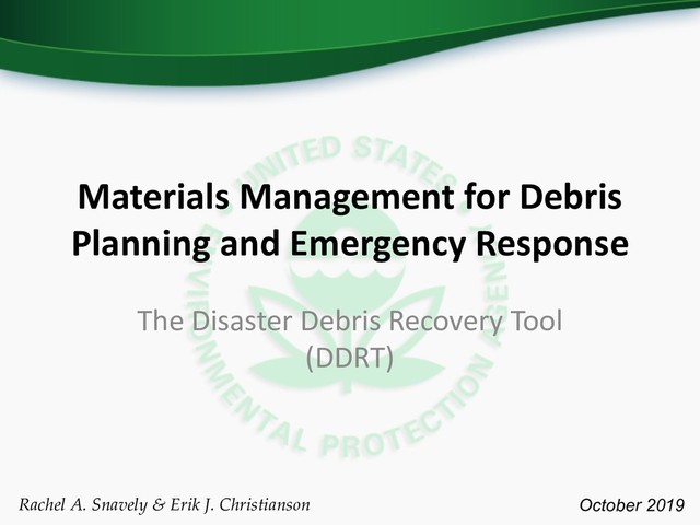 Region 6 Region 10 Region 9 Region 8 Region 7 Region 4 Region 5 Region 3 Region 2 Region 1 R10 R09 US EPA Disaster Debris Recovery Tool Data Collection Plan 2015 US EPA Disaster Debris Recovery Tool Data Publishing Plan December 2019 – Early 2020 DDRT Web App ArcGIS Online