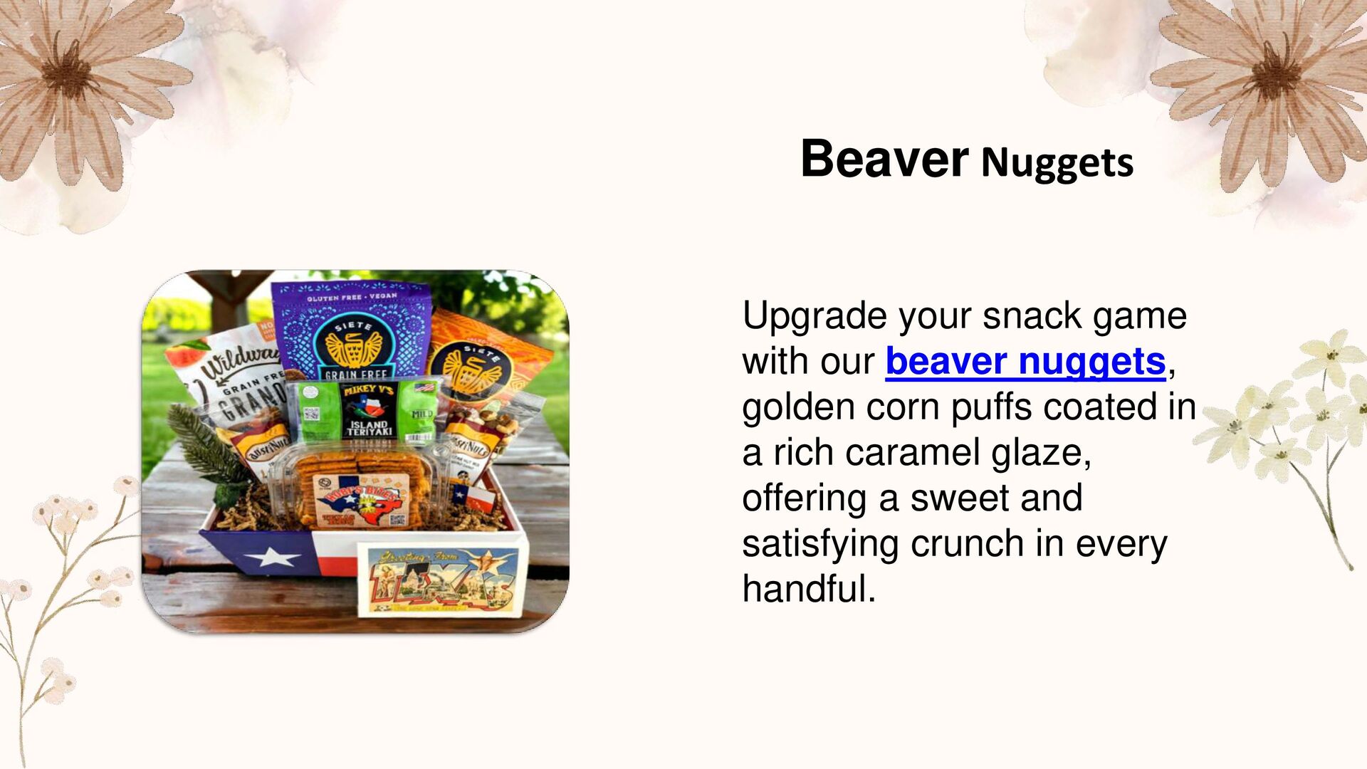 Upgrade your snack game with our beaver nuggets, golden corn puffs coated in a rich caramel glaze, offering a sweet and satisfying crunch in every handful.