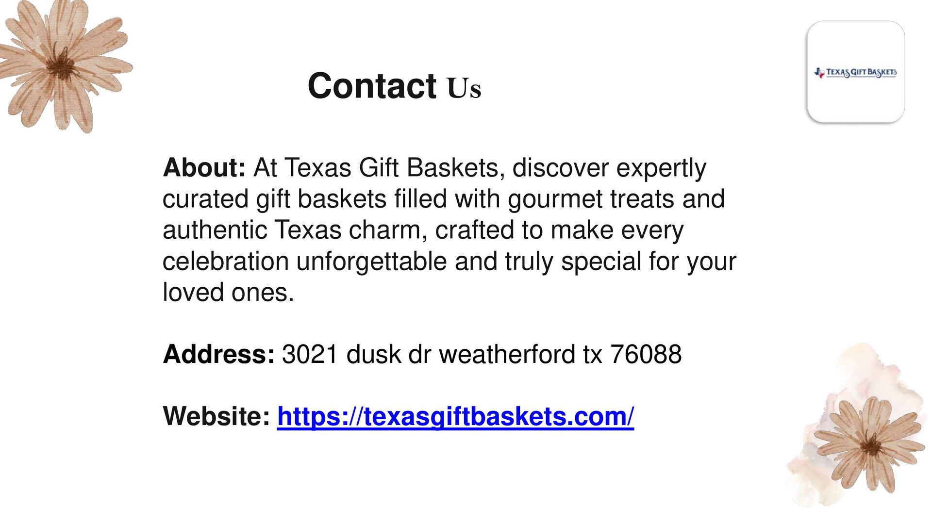 gift baskets filled with gourmet treats and authentic Texas charm, crafted to make every celebration unforgettable and truly special for your loved ones. Address: 3021 dusk dr weatherford tx 76088 Website: https://texasgiftbaskets.com/