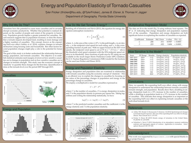 H. Jagger Department of Geography. Florida State University Why Did We Do This? Tornadoes have the potential to cause mass casualties and to severely disrupt economic productivity. Whether that potential is realized de- pends on the number of people and extent of the property in harm’s way. Population growth implies a greater potential for casualties. Re- cent research suggests that as population increases, so does the chance that a tornado impacts developed land, resulting in more damage and a higher numbers of casualties. This concept, known as the expand- ing bull’s-eye effect (Ashley et al. 2014), explains changes in tornado destruction using housing units and households. But other factors be- yond population changes might play a role in the potential for future losses. The goal of this study is to better understand the relationship between energy, population, and tornado casualties. The objective is to estab- lish statistical estimates (and margins of error) on how sensitive casual- ties are to changes in population and on how sensitive casualties are to changes in tornado strength. This study uses the economic concept of ‘elasticity’ to quantify these changes for the first time. Quantification is done at the tornado level over the period 2007 through 2015. Energy and Population 0 30 60 90 120 106 108 1010 1012 1014 Energy Dissipation (J) Number of Tornadoes 0 50 100 0.0 2.5 5.0 7.5 Population Density Number of Tornadoes Casualties 1 10 100 1 10 Casualties Number of Tornadoes 10 100 1000 Number of Casualties Tornado Casualties [2007−2015] How Do We Get Tornado Energy? Building off of Schielicke and Névir (2011), the equation for energy dis- sipation (atmosphere moment) is E = 1 2 Av l¯ ρ J j=0 wj v2 j , (1) where Av is the area of the vortex (πR2), l is the path length, ¯ ρ is air den- sity, vj is the midpoint wind speed for each rating, and wj is the corre- sponding fraction of path area. With no upper bound on the EF5 wind speeds, the midpoint wind speed is set at 97 m s−1 (7.5 m s−1 above the threshold wind speed consistent with the EF4 midpoint speed rel- ative to its threshold). Since fractions of path area by EF rating are not available in the much larger Storm Prediction Center (SPC) database, the U.S. Nuclear Regulatory Commission (NRC) model for the fractions can be used (see Fricker and Elsner 2015). Energy and Population Elasticity Energy dissipation and population data are examined in relationship with tornado casualties using the economic concept of ‘elasticity’. This is an efficient way to explain the changes in casualties by focusing on the ratios of the percentage changes in population and energy to the percentage change in casualties. We employ a multiplicative model for casualties expressed as C ∼ Eα · Pβ, (2) where C is the number of casualties, E is energy dissipation in joules, and P is the population density in persons per square km. Taking log- arithms and writing the relationship statistically, we have log( ˆ C) = ˆ α · log(E) + ˆ β · log(P), (3) where ˆ C is the predicted number casualties and the coefficient ˆ α is the energy elasticity and ˆ β is the population elasticity. Multiplicative Regression Model The data are fit to the model (Eq. 3) using ordinary least squares. The R2 is .31 indicating that energy dissipation and population explains 31% of the casualties. Population and energy dissipation are both significant factors in explaining the number of casualties as expected. Coefficient Estimate Std. Error t value Pr(> |t|) ˆ α .206 .011 18.907 < 0.0001 ˆ β .223 .022 9.484 < 0.0001 Casualties, Energy Dissipation, and Population Tuscaloosa−Birmingham (2011−04−27) 10 1000 106 108 1010 1012 1014 Energy Dissipation (J) Number of Casualties 10 1000 10 1000 Population Density Number of Casualties How Sensitive Is the Model? Years EF Range Months Energy elasticity Population elasticity 2007-2015 EF0+ 1-12 15%([14%, 17%]) 17%([14%, 20%]) 1998-2006 EF0+ 1-12 13%([11%, 14%]) 9%([7%, 12%]) 1989-1997 EF0+ 1-12 11%([10%, 12%]) 10%([7%, 12%]) 1980-1988 EF0+ 1-12 11%([10%, 13%]) 8%([6%, 10%]) 2007-2015 EF1+ 1-12 17%([15%, 18%]) 18%([14%, 21%]) 2007-2015 EF2+ 1-12 19%([17%, 22%]) 26%([21%, 30%]) 2007-2015 EF3+ 1-12 29%([23%, 34%]) 43%([34%, 52%]) 2007-2015 EF0+ 4-6 15%([11%, 18%]) 19%([12%, 27%]) 2007-2015 EF0+ 12-2 17%([9%, 26%]) 17%([0%, 35%]) Conclusions Here, we quantify the expanding bull’s-eye effect, along with energy dissipation to understand the relationship between tornado casualties, tornado strength, and population. Results show that a doubling in en- ergy dissipation leads to a 15% increase in the number of casualties, while a doubling in population leads to a 17% increase in the number of casualties. This indicates that energy dissipation is as important as the expanding bull’s-eye effect in explaining tornado casualties at the individual tornado level. References • Ashley WS, Strader S, Rosencrants T, Krmenec AJ (2014) Spatiotemporal changes in tornado hazard exposure: The case of the expanding bull’s-eye effect in chicago, illinois. Wea Climate Soc 6: 175-193. • Fricker T, Elsner JB (2015) Kinetic energy of tornadoes in the United States. PLoSONE 10: e0131090. • Schielicke L, Névir P (2011) Introduction of an atmospheric moment combining eulerian and lagrangian aspects of vortices: Application to tornadoes. Atmo- spheric Research 100: 357-365. Acknowledgment This work was supported by Experiment.com with special thanks to our project backers.