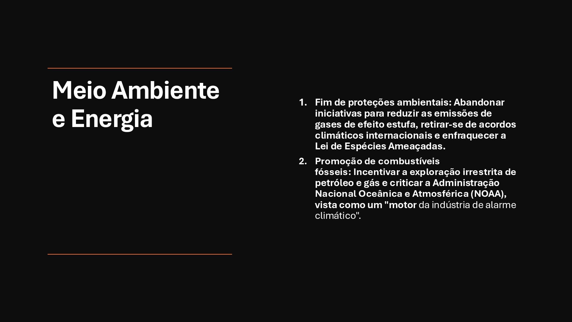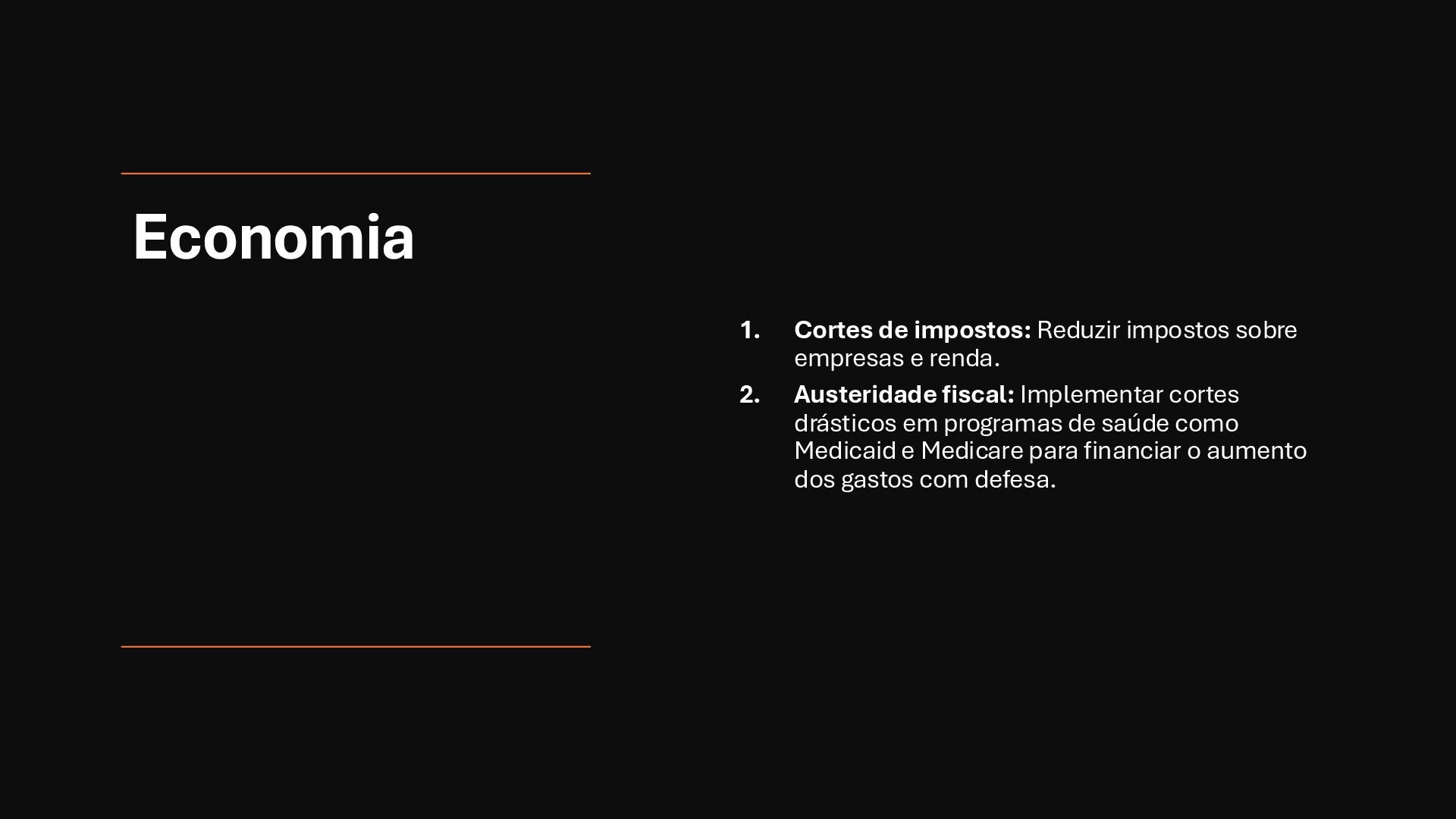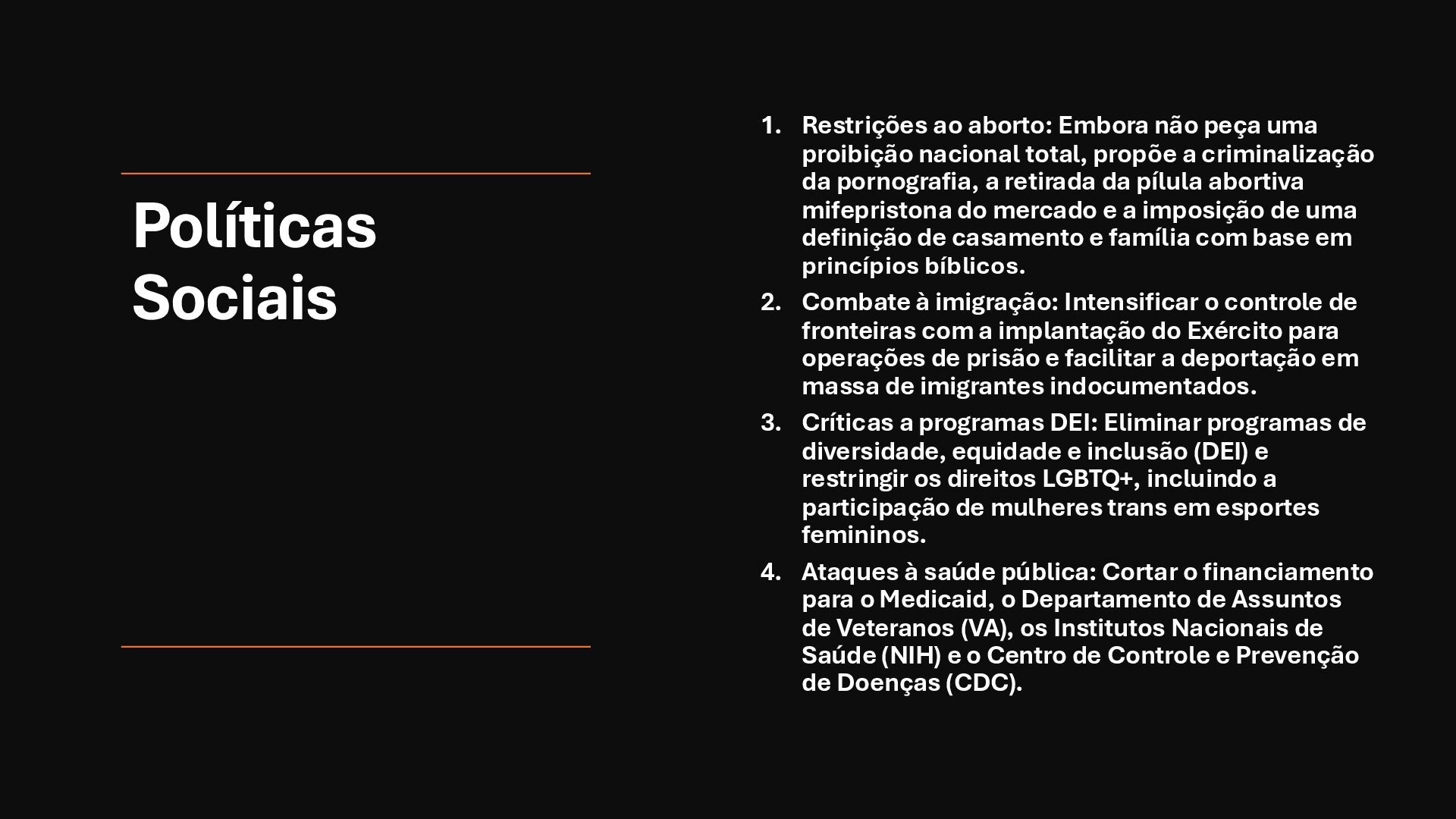 proibição nacional total, propõe a criminalização da pornografia, a retirada da pílula abortiva mifepristona do mercado e a imposição de uma definição de casamento e família com base em princípios bíblicos. 2. Combate à imigração: Intensificar o controle de fronteiras com a implantação do Exército para operações de prisão e facilitar a deportação em massa de imigrantes indocumentados. 3. Críticas a programas DEI: Eliminar programas de diversidade, equidade e inclusão (DEI) e restringir os direitos LGBTQ+, incluindo a participação de mulheres trans em esportes femininos. 4. Ataques à saúde pública: Cortar o financiamento para o Medicaid, o Departamento de Assuntos de Veteranos (VA), os Institutos Nacionais de Saúde (NIH) e o Centro de Controle e Prevenção de Doenças (CDC).
