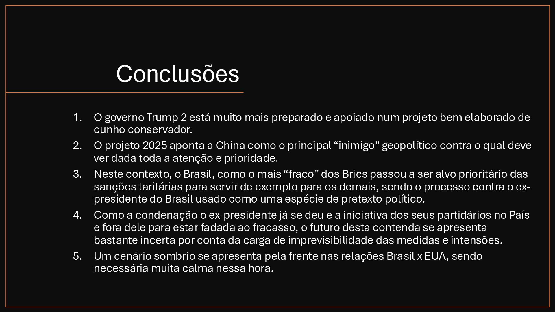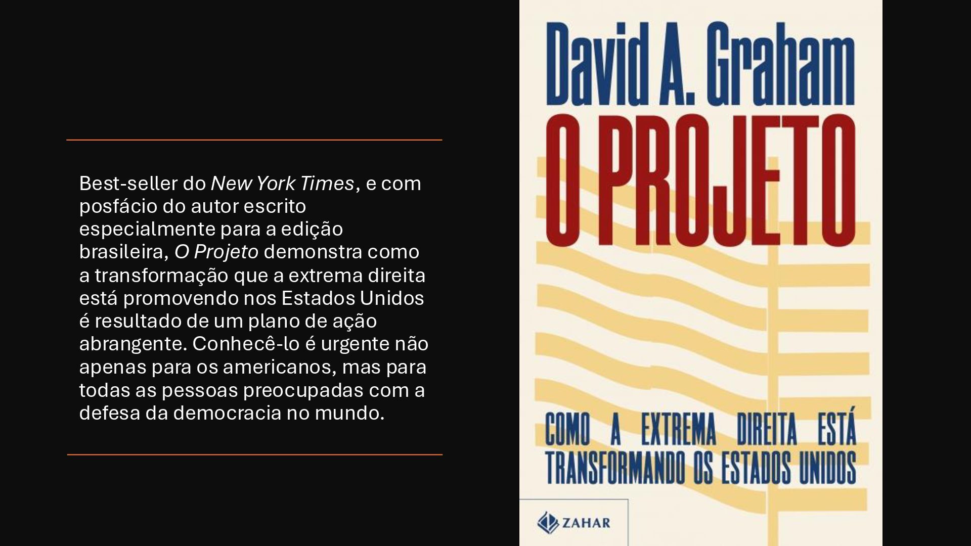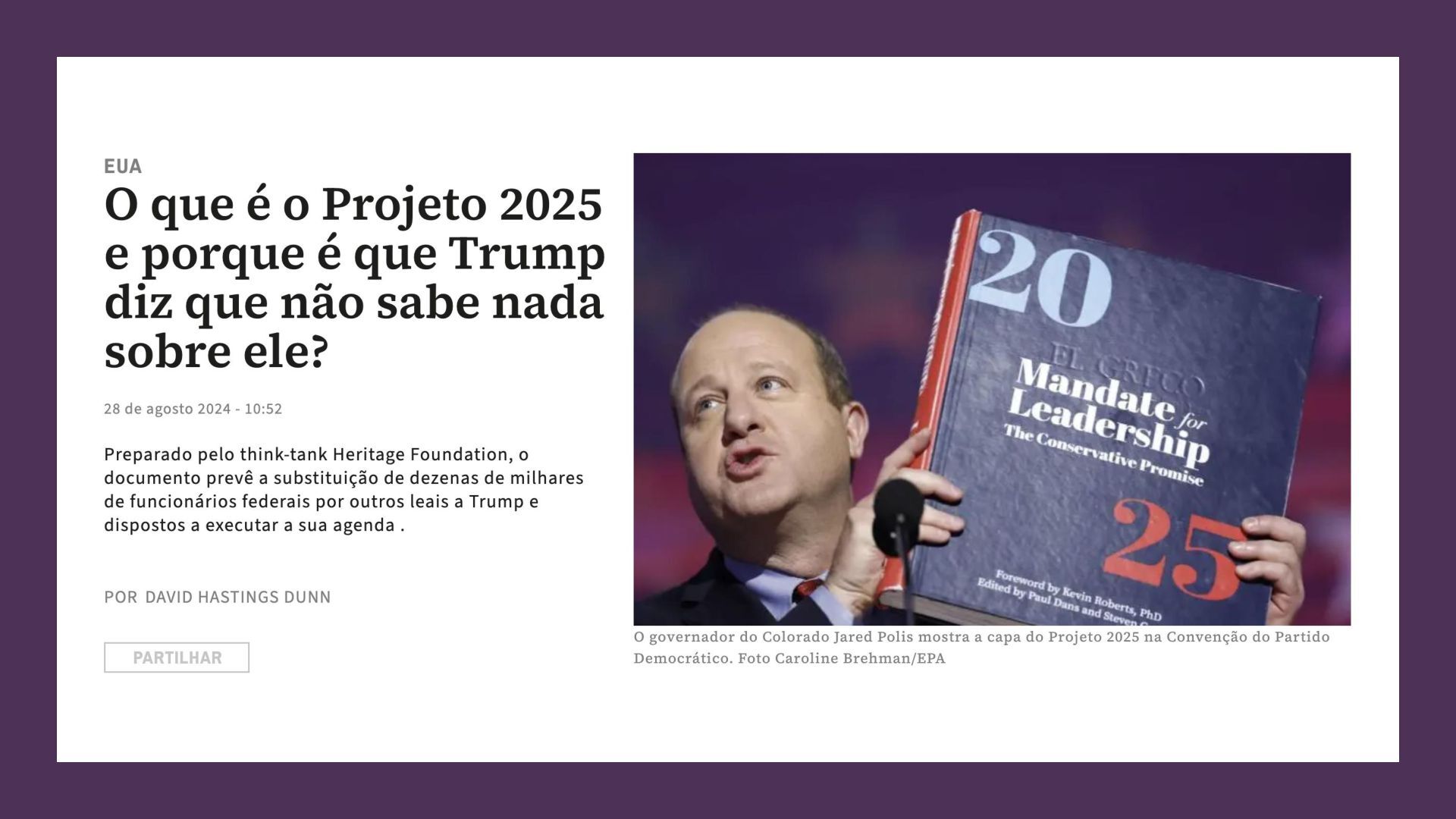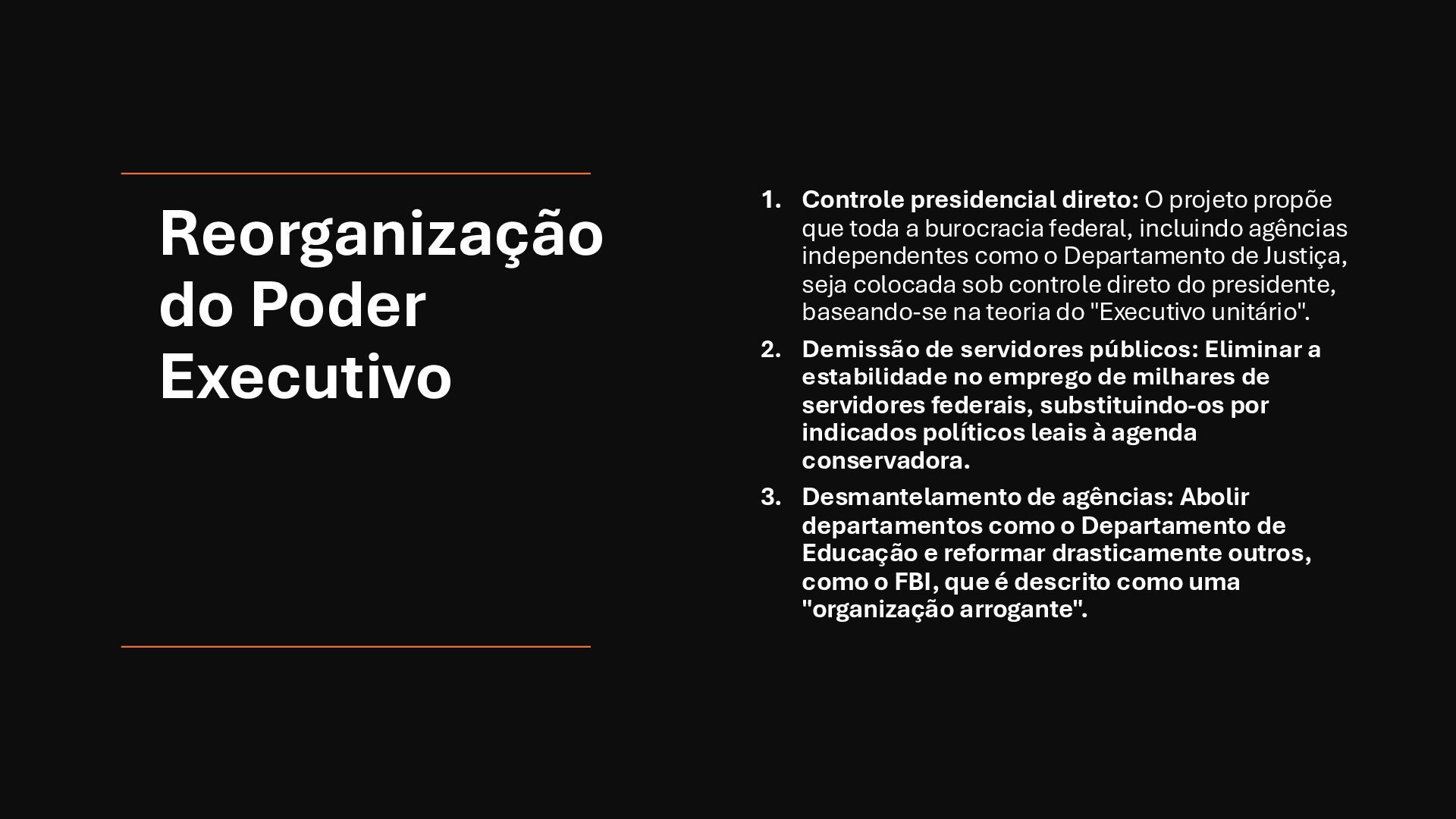 proibição nacional total, propõe a criminalização da pornografia, a retirada da pílula abortiva mifepristona do mercado e a imposição de uma definição de casamento e família com base em princípios bíblicos. 2. Combate à imigração: Intensificar o controle de fronteiras com a implantação do Exército para operações de prisão e facilitar a deportação em massa de imigrantes indocumentados. 3. Críticas a programas DEI: Eliminar programas de diversidade, equidade e inclusão (DEI) e restringir os direitos LGBTQ+, incluindo a participação de mulheres trans em esportes femininos. 4. Ataques à saúde pública: Cortar o financiamento para o Medicaid, o Departamento de Assuntos de Veteranos (VA), os Institutos Nacionais de Saúde (NIH) e o Centro de Controle e Prevenção de Doenças (CDC).